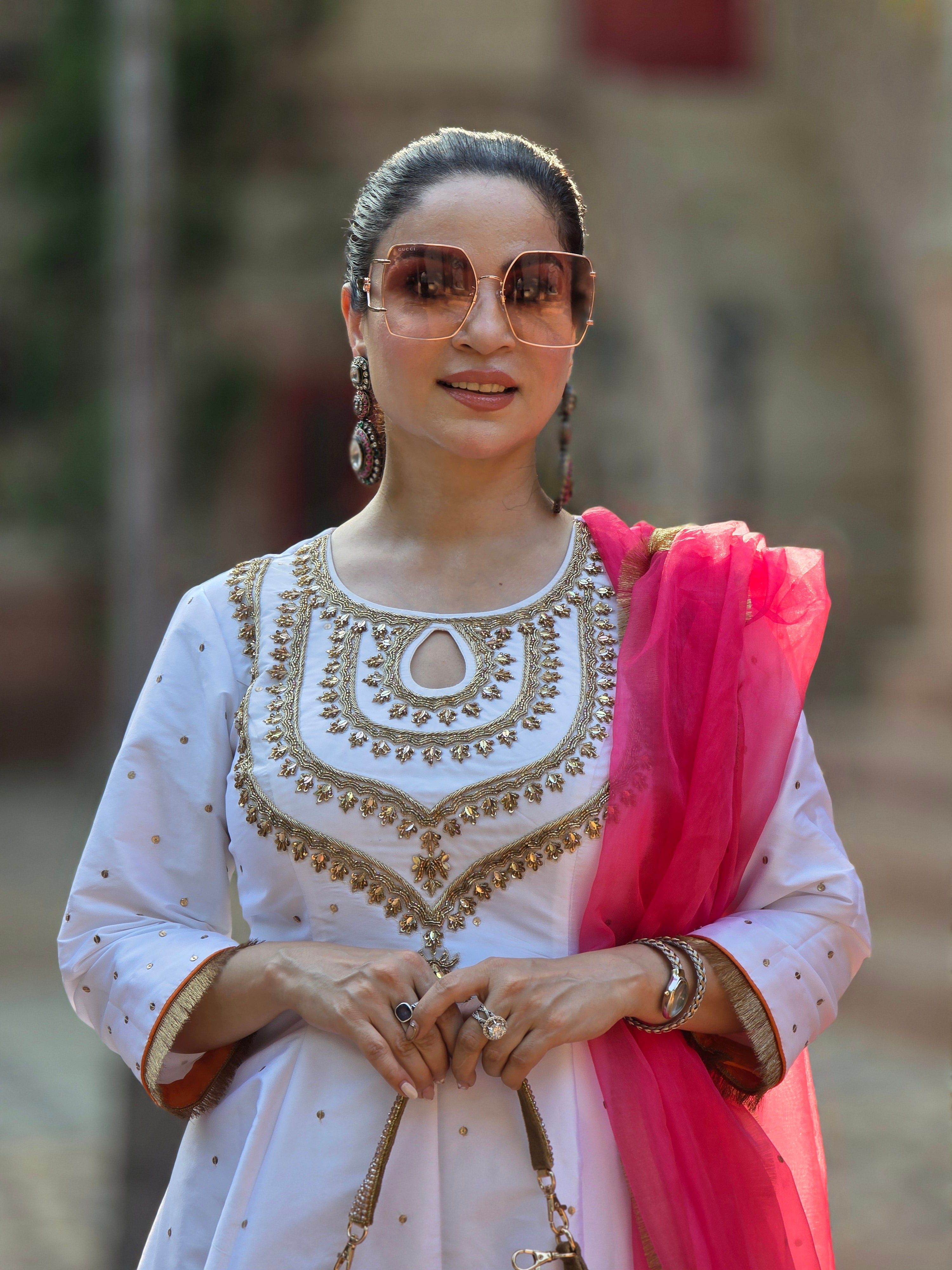 No. of components - 3: A-line kurta, pants, dual colour dupatta, Fabric - Tafata silk , Color - white, work - handwork, Fit - According to measurements