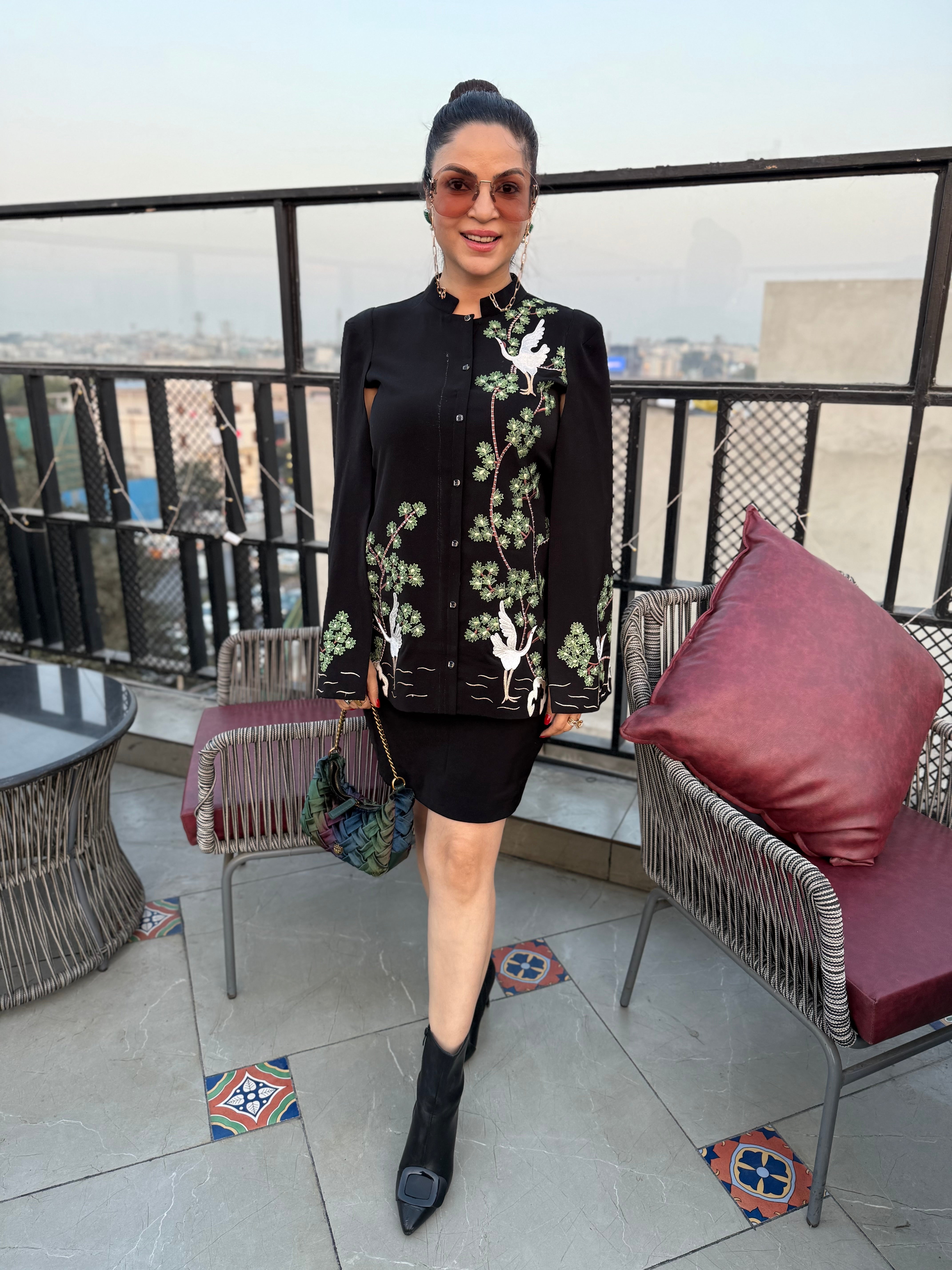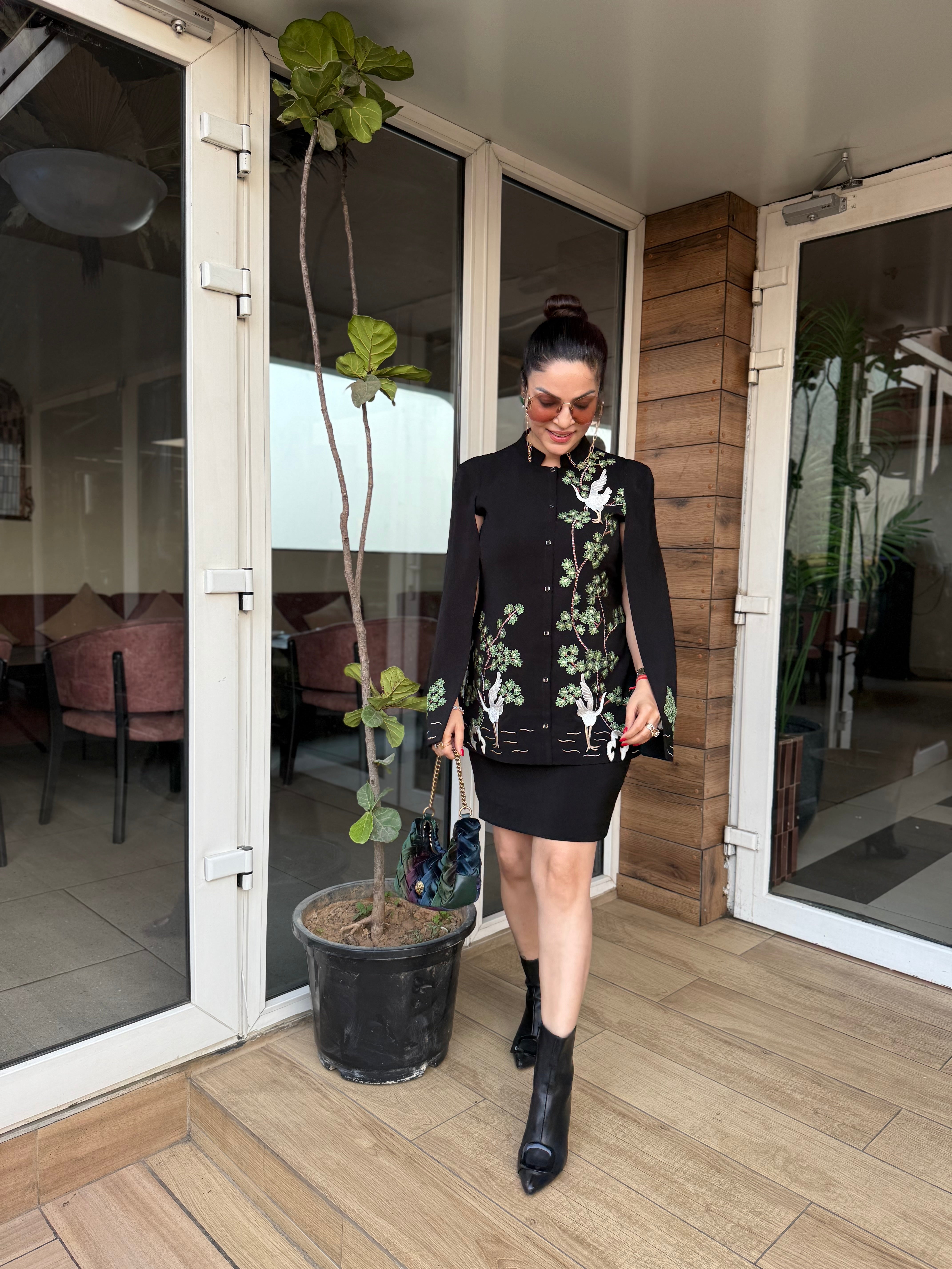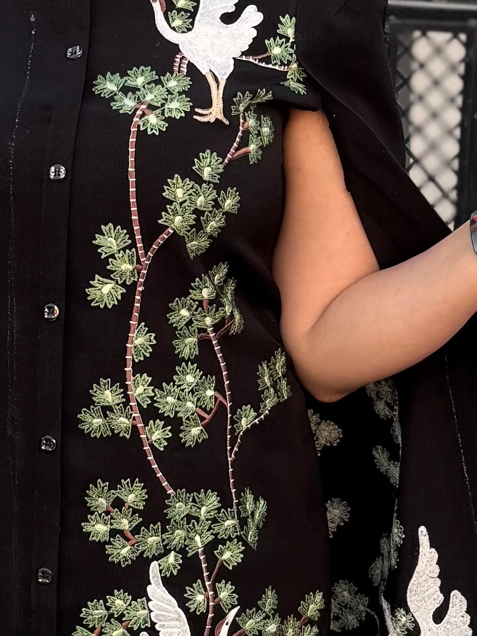 No. of components - 2 open cape with skirt , Fabric - Crepe , Color - Black, work - Machine work, Fit - According to measurements