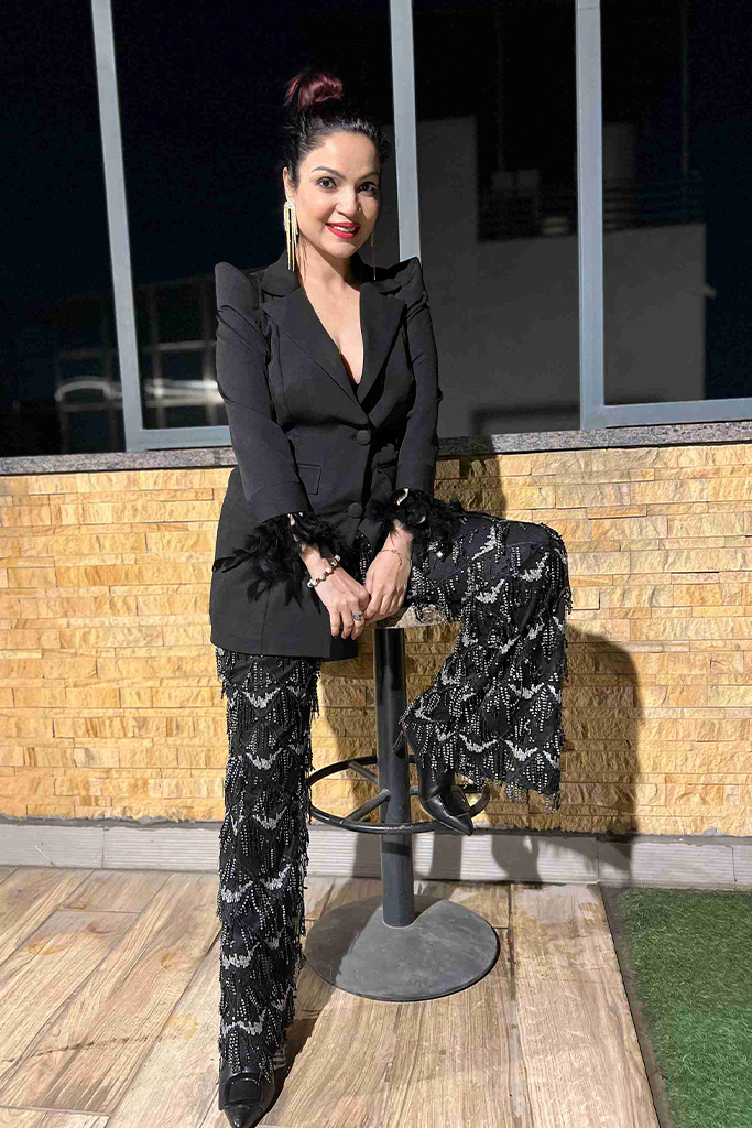 Russian Lycra Blazer with feather detaling along with blingy pants.