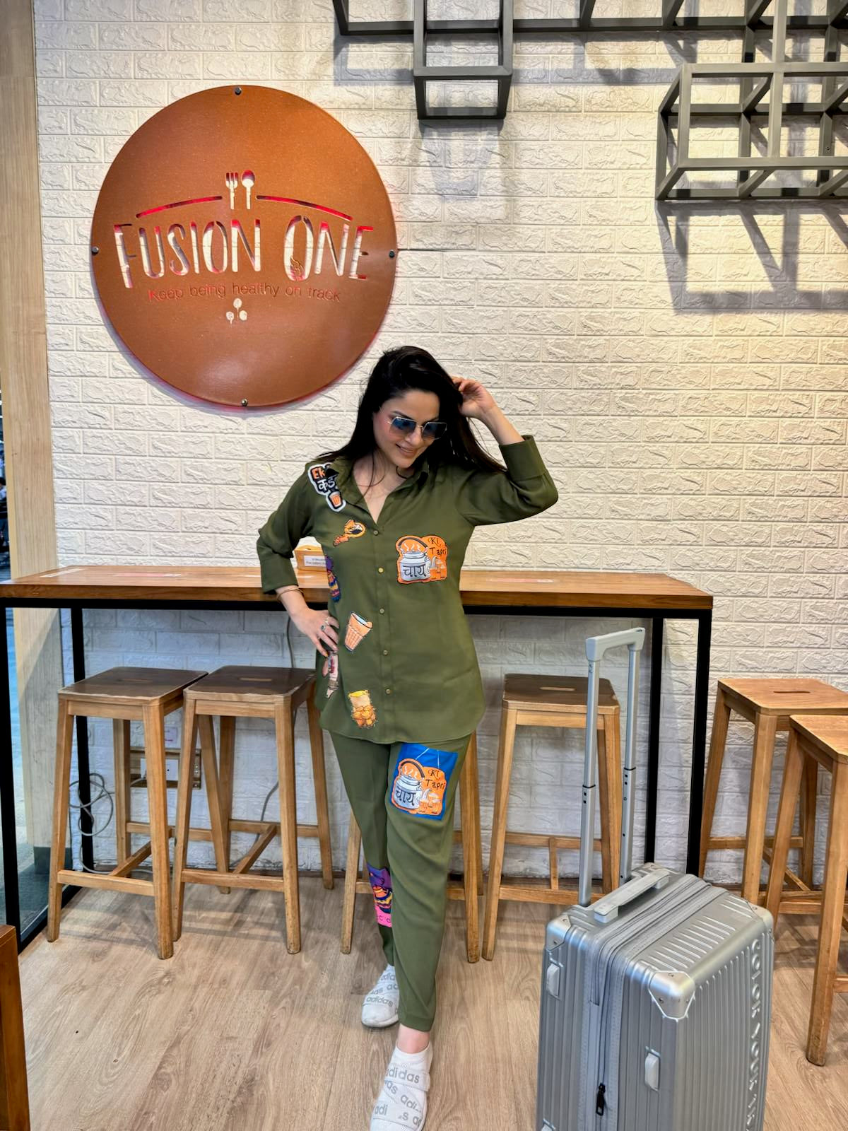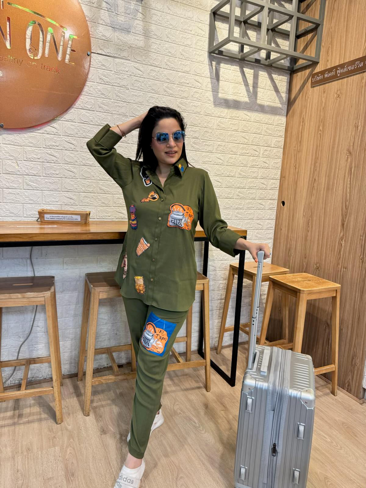 NO. OF COMPONENTS - 2COMPONENTS - Top & PantsFABRIC - GeorgetteCOLOUR - Olive GreenWORK - Machine workFIT...