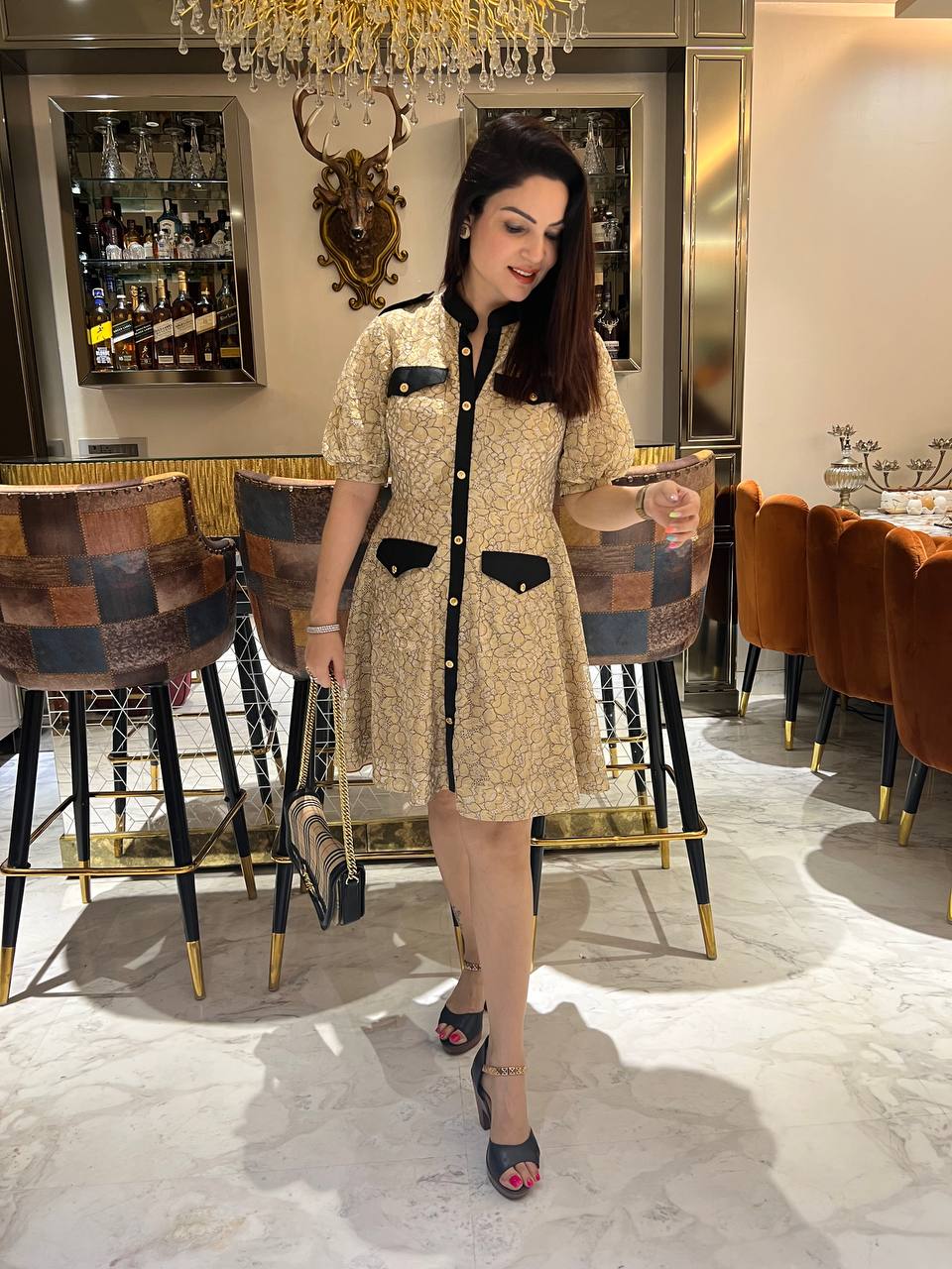 This Chantilly lace dress will turn heads with its balloon sleeves and pocket flaps. Crafted with elegant detail, this dress is sure to be an impressive addition to any wardrobe.