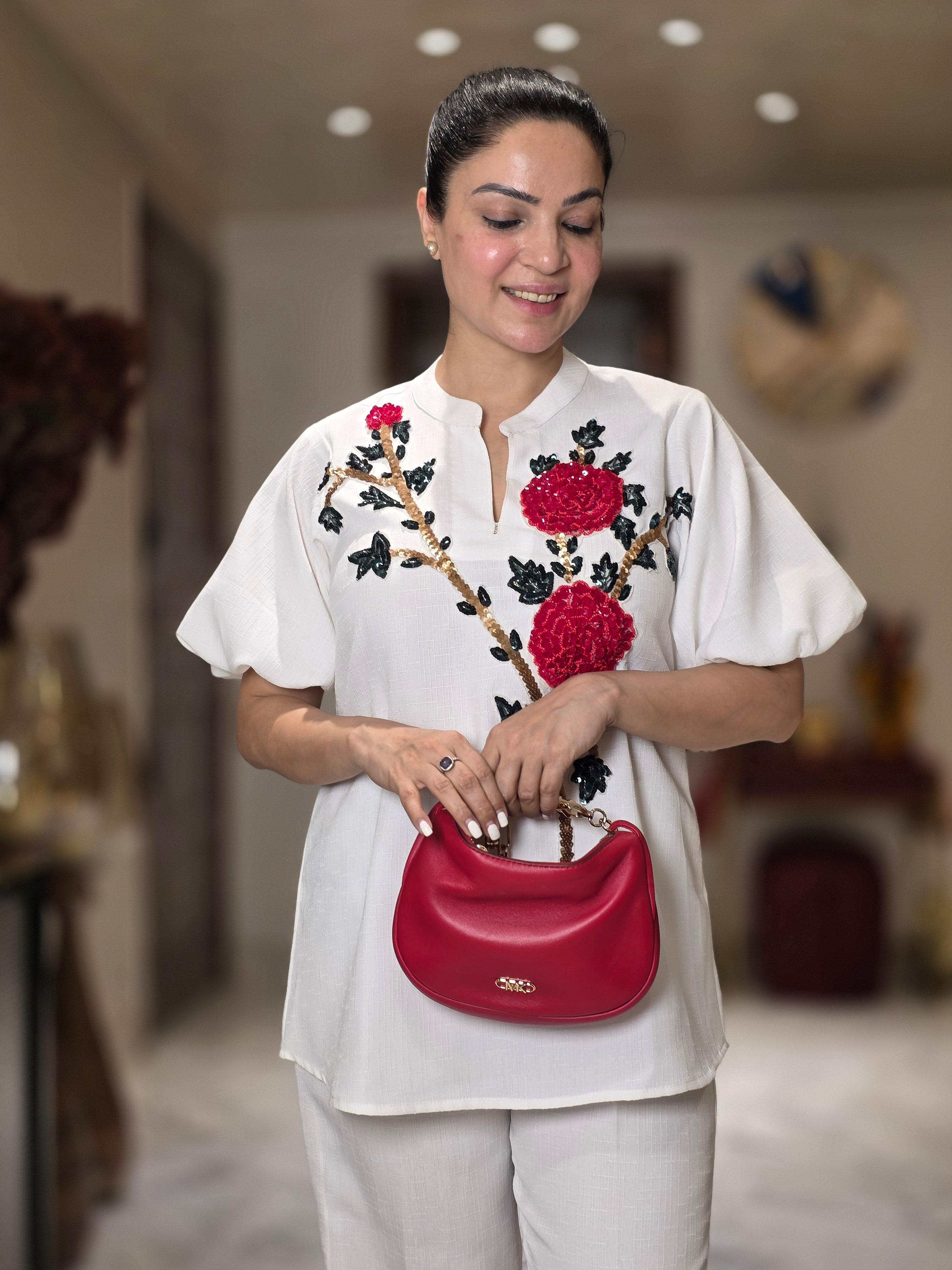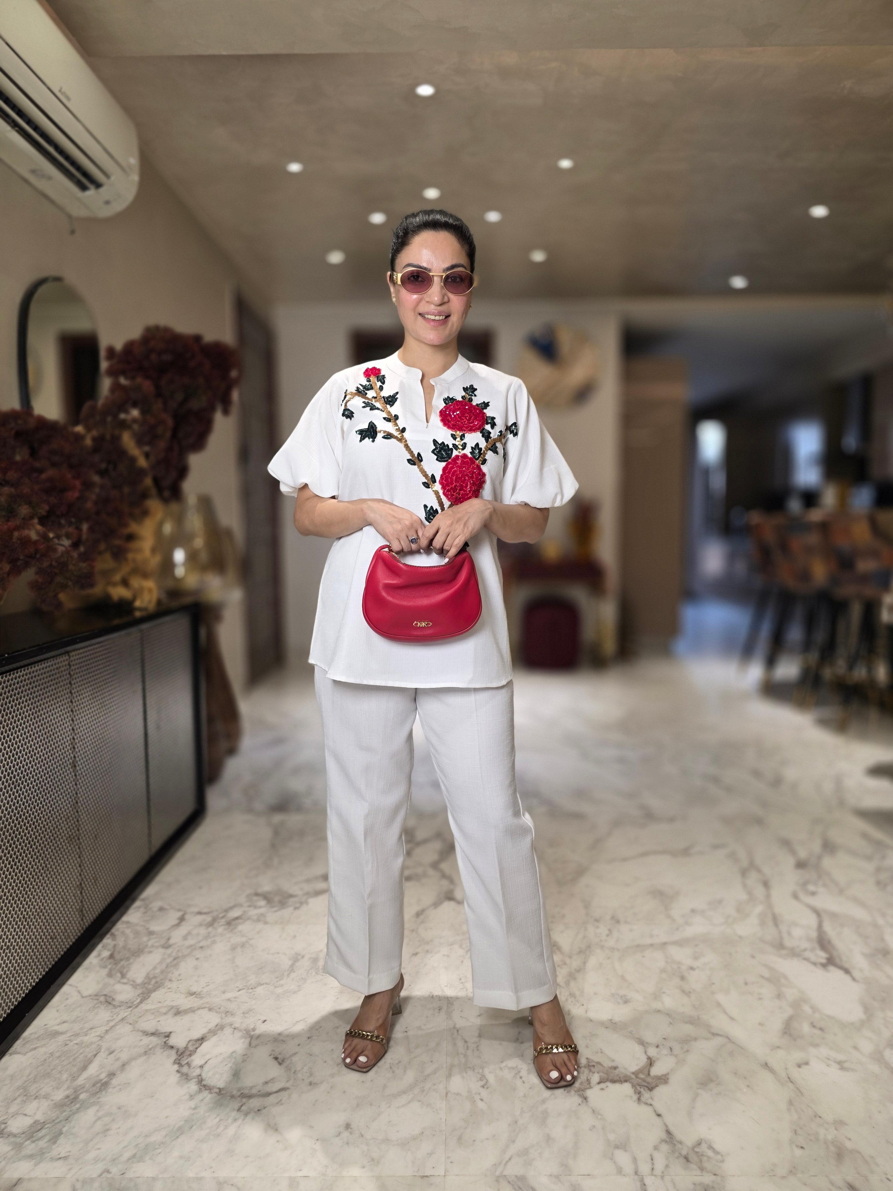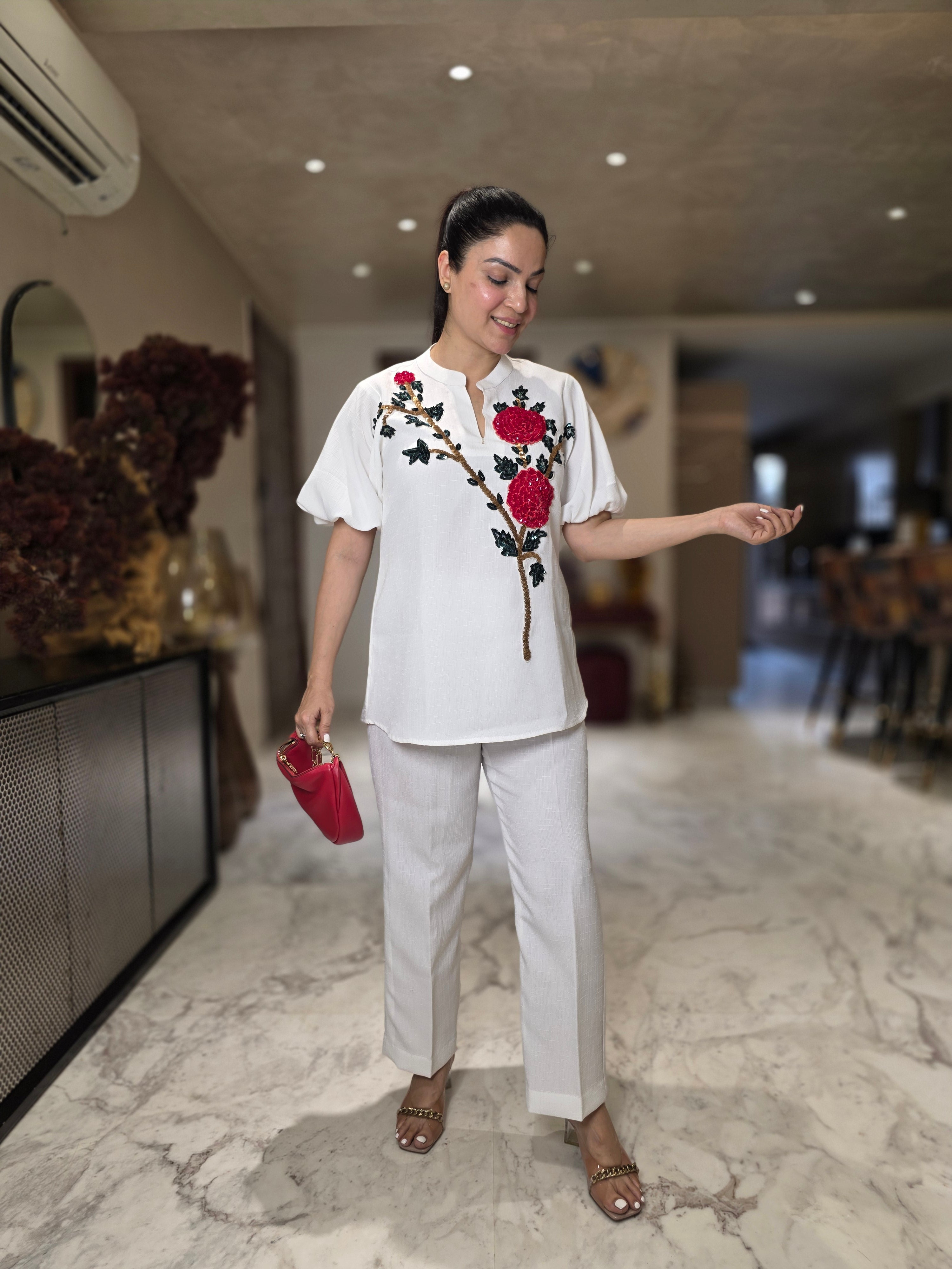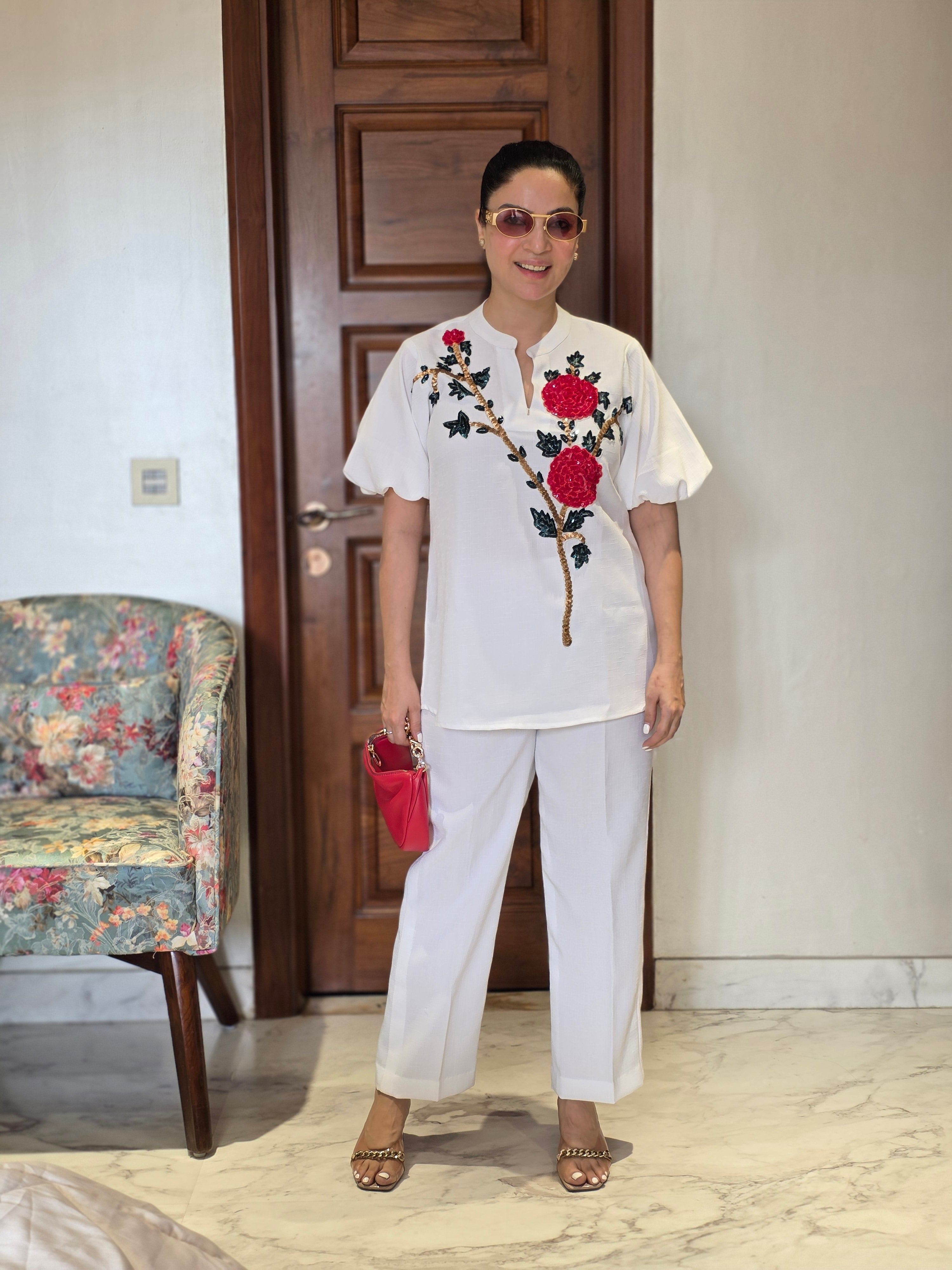 No. of components - 2 : top & pants, Fabric - Cotton linen , Color - white, work - handwork, Fit - According to measurements