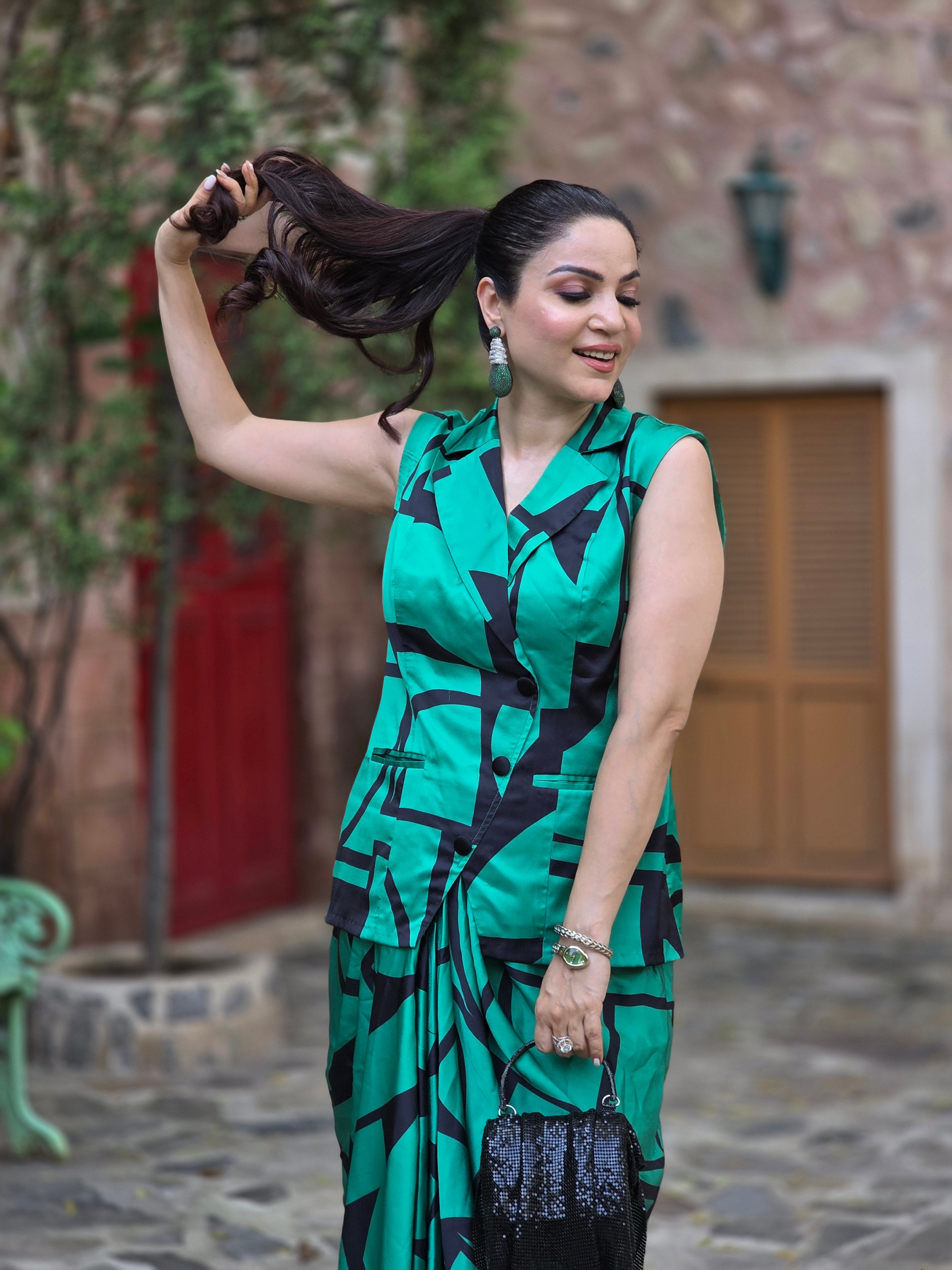 No. of components - 2: vest & drape, Fabric - satin , Color - black & green, Fit - According to measurements