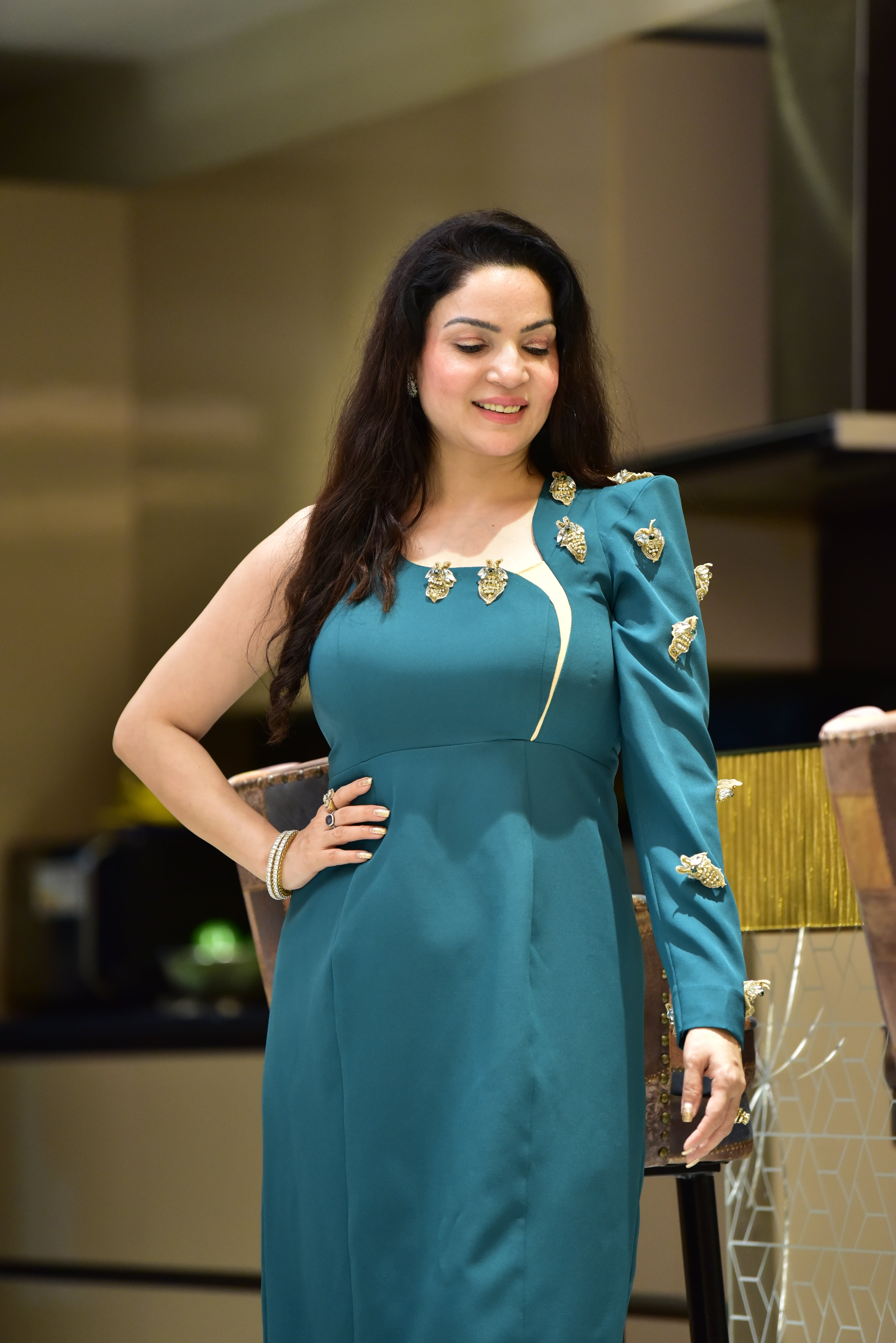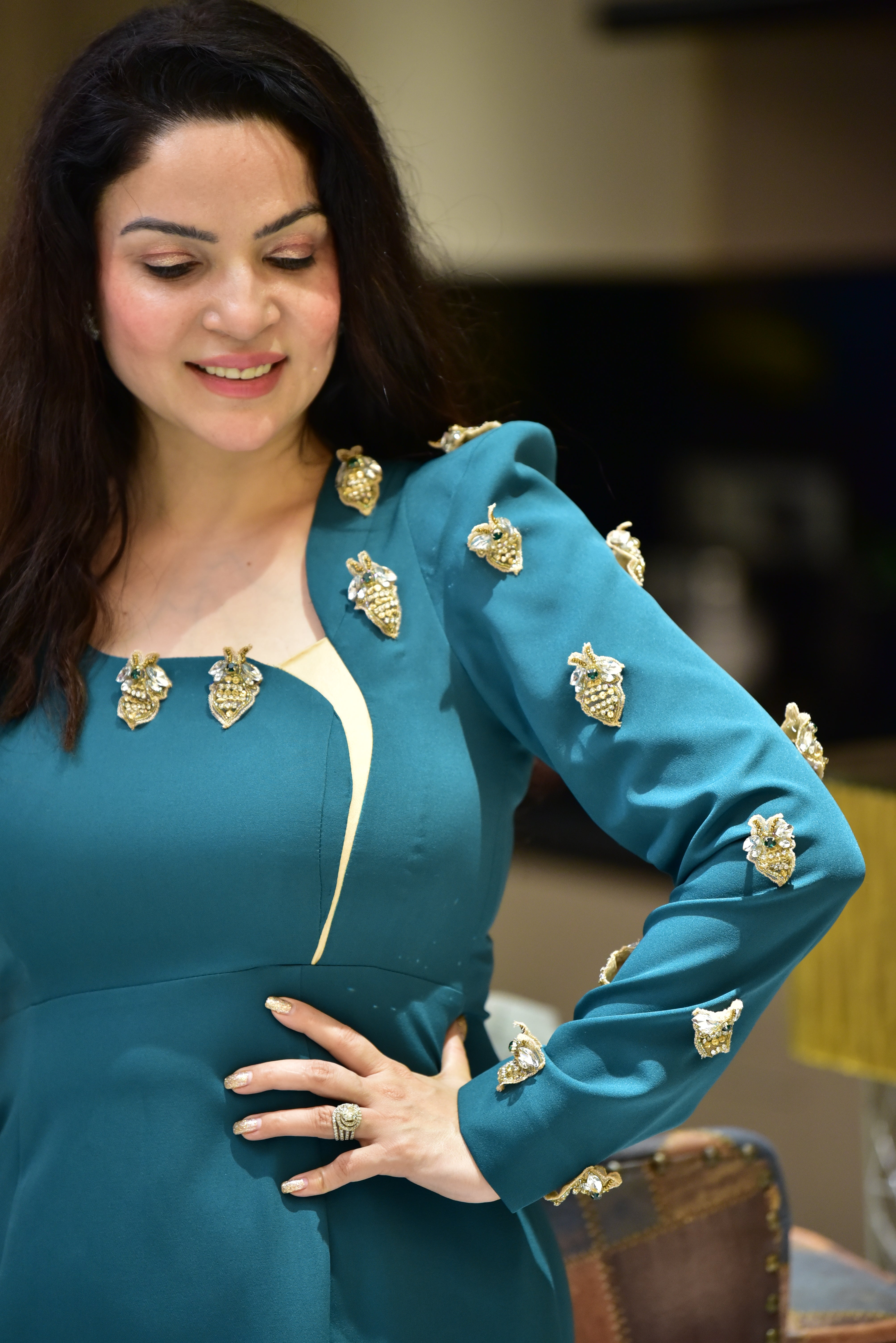 No. of components - 1 Dress , Fabric - Russian Lycra  , Color - Teal Green, work - Handwork, Fit - According to measurements