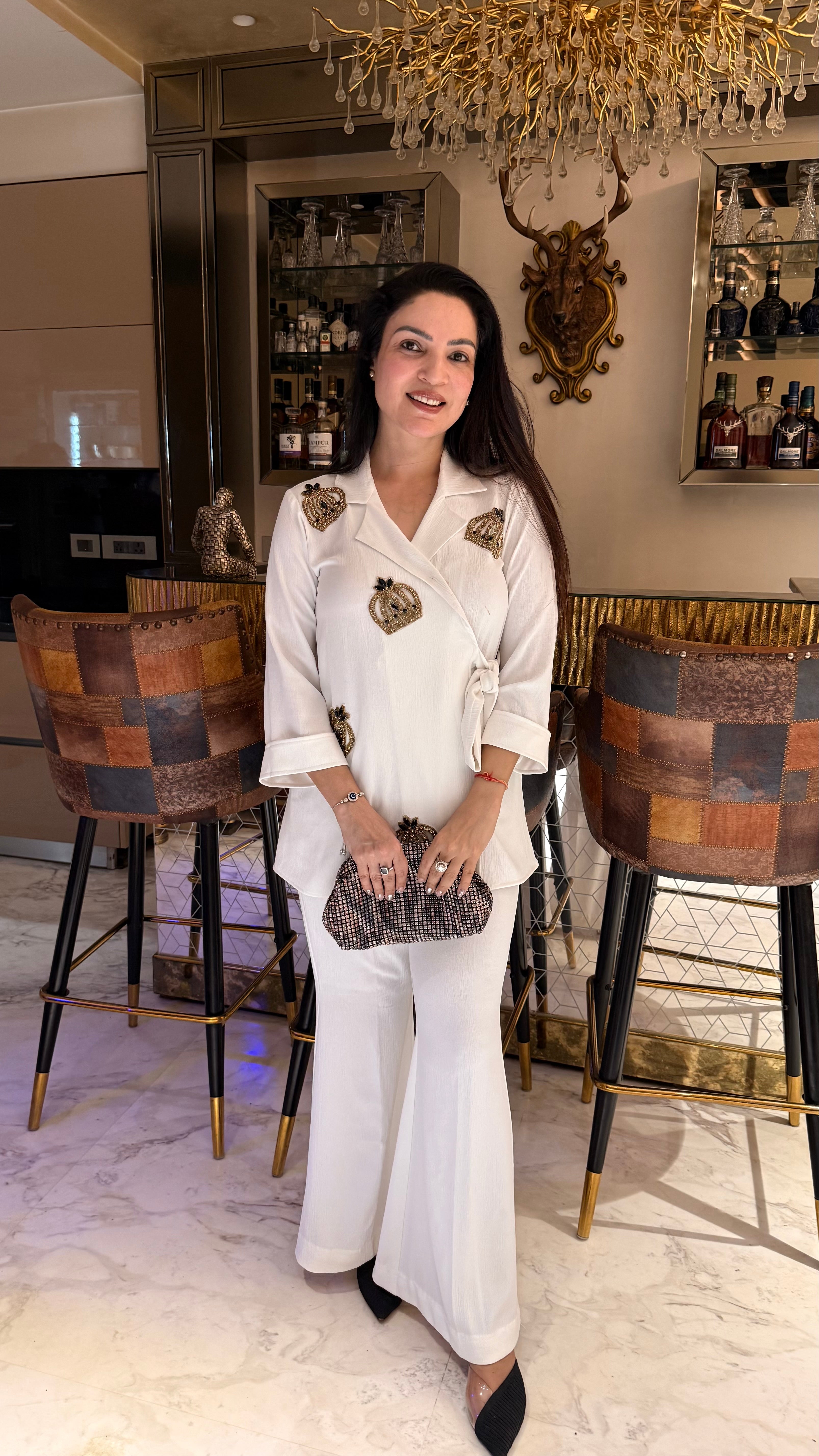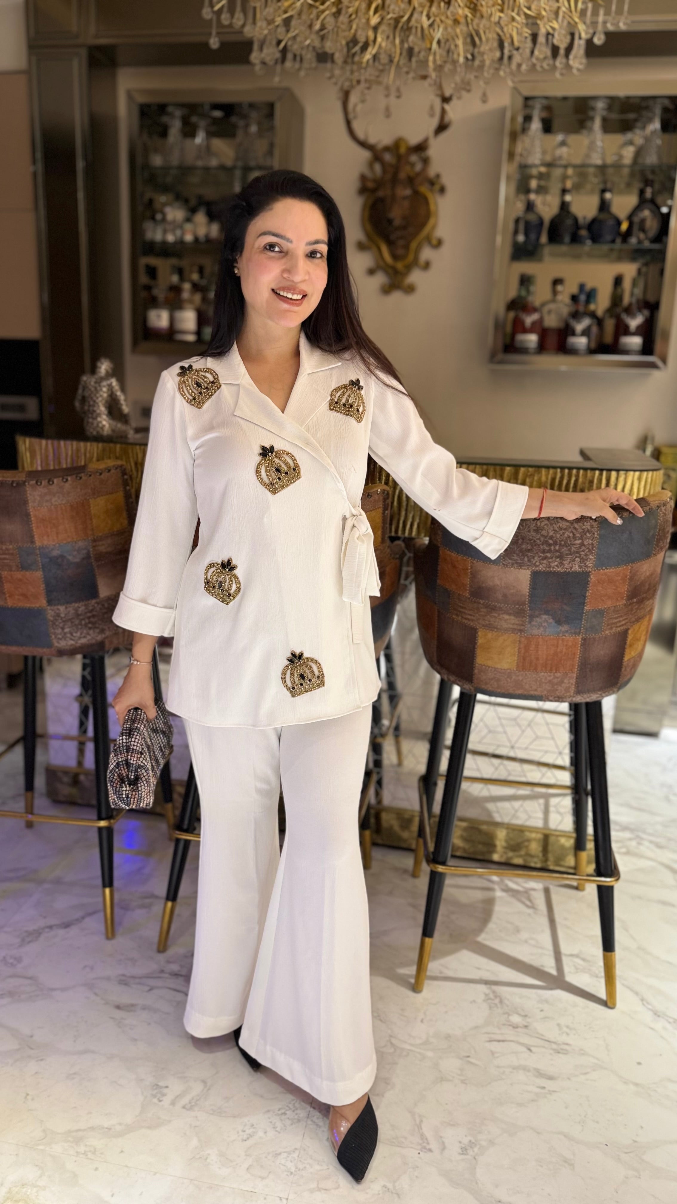 No. of components - 2: top and pants, Fabric - cotton Lycra , Color - white, work - handwork, Fit - According to measurements