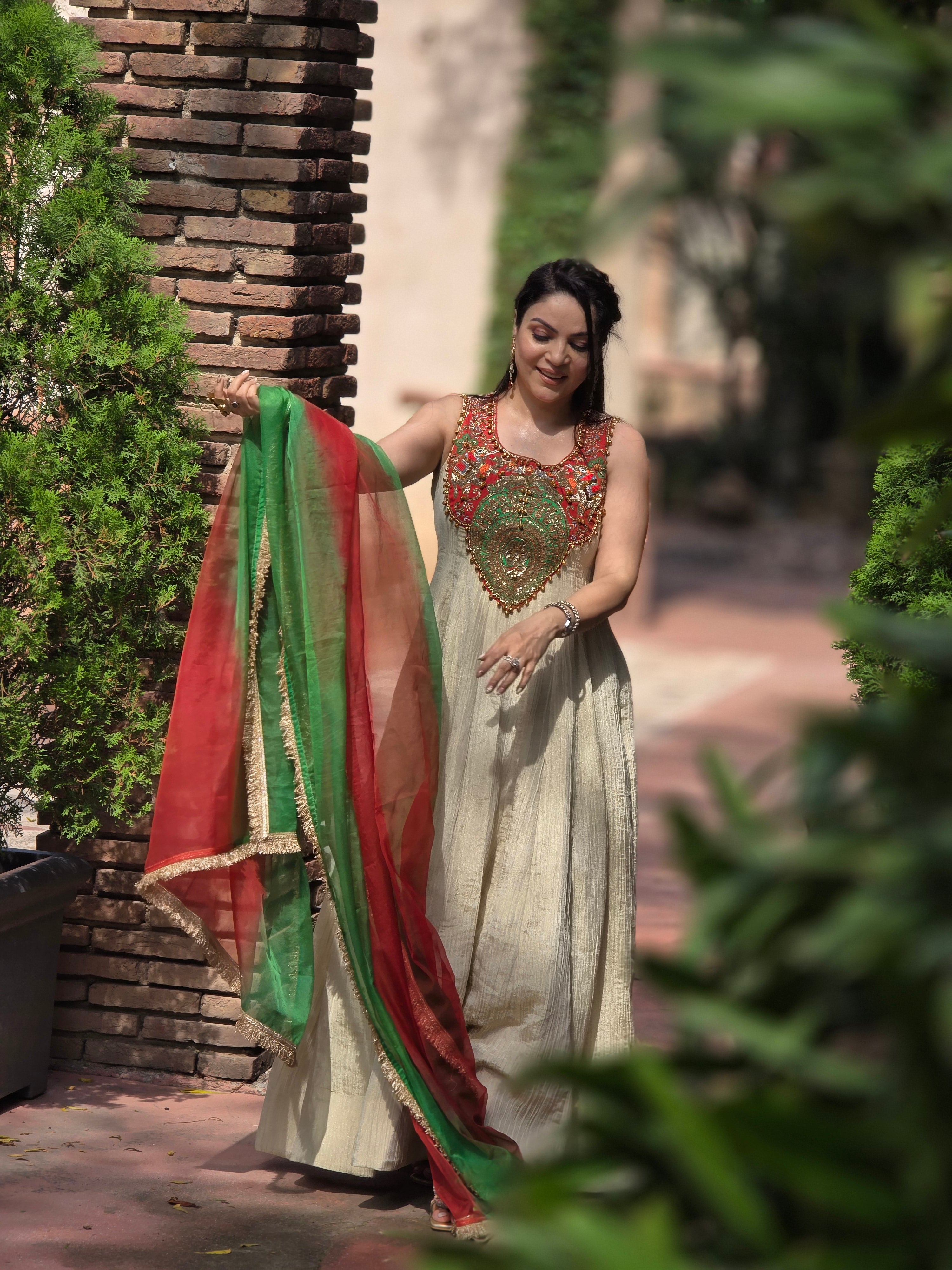 No. of components - 2: Anarkali & dupatta, Fabric - crush fabric , Color - beige, work - handwork, Fit - According to measurements