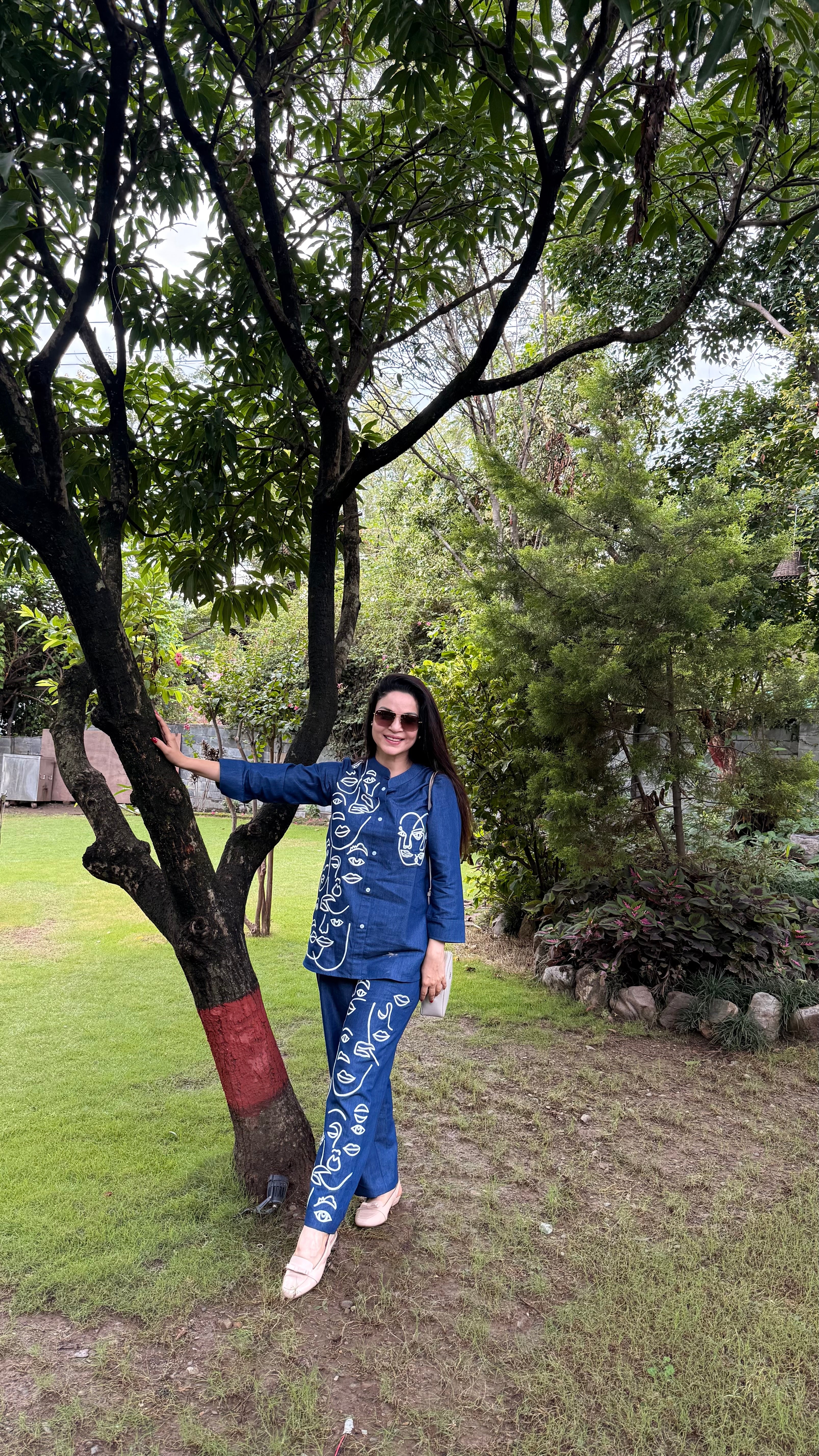 No. of components - 2: top & pants , Fabric - cotton denim, colour- blue, Fit - According to measurements, work - machine work