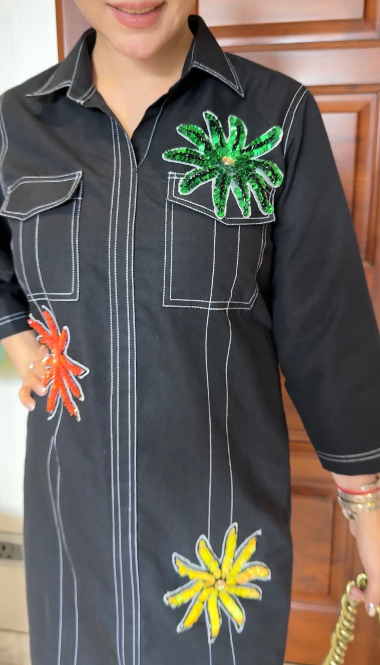 No. of components - 1: dress, Fabric - cotton denim , Color - black, work - handwork, Fit - According to measurements