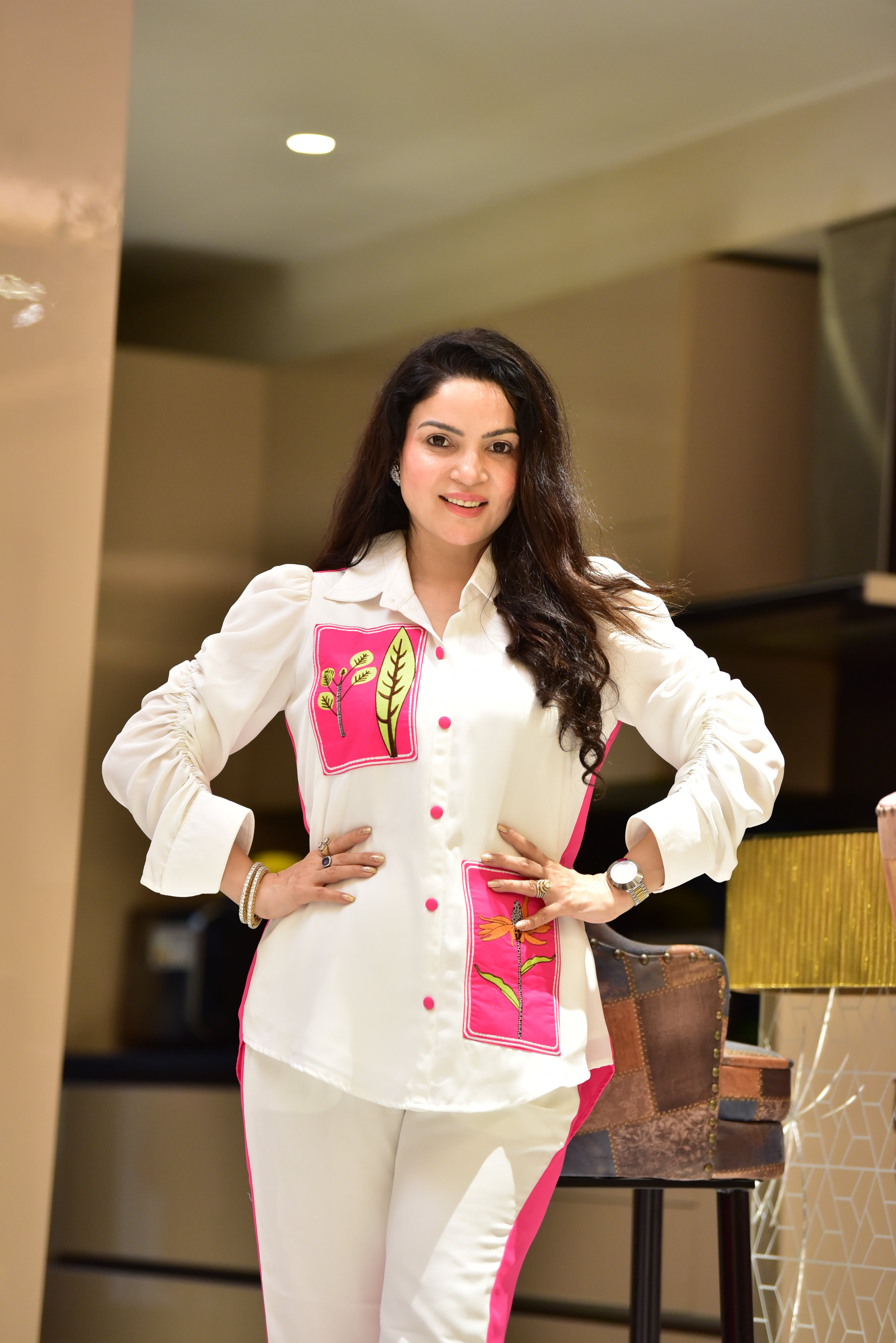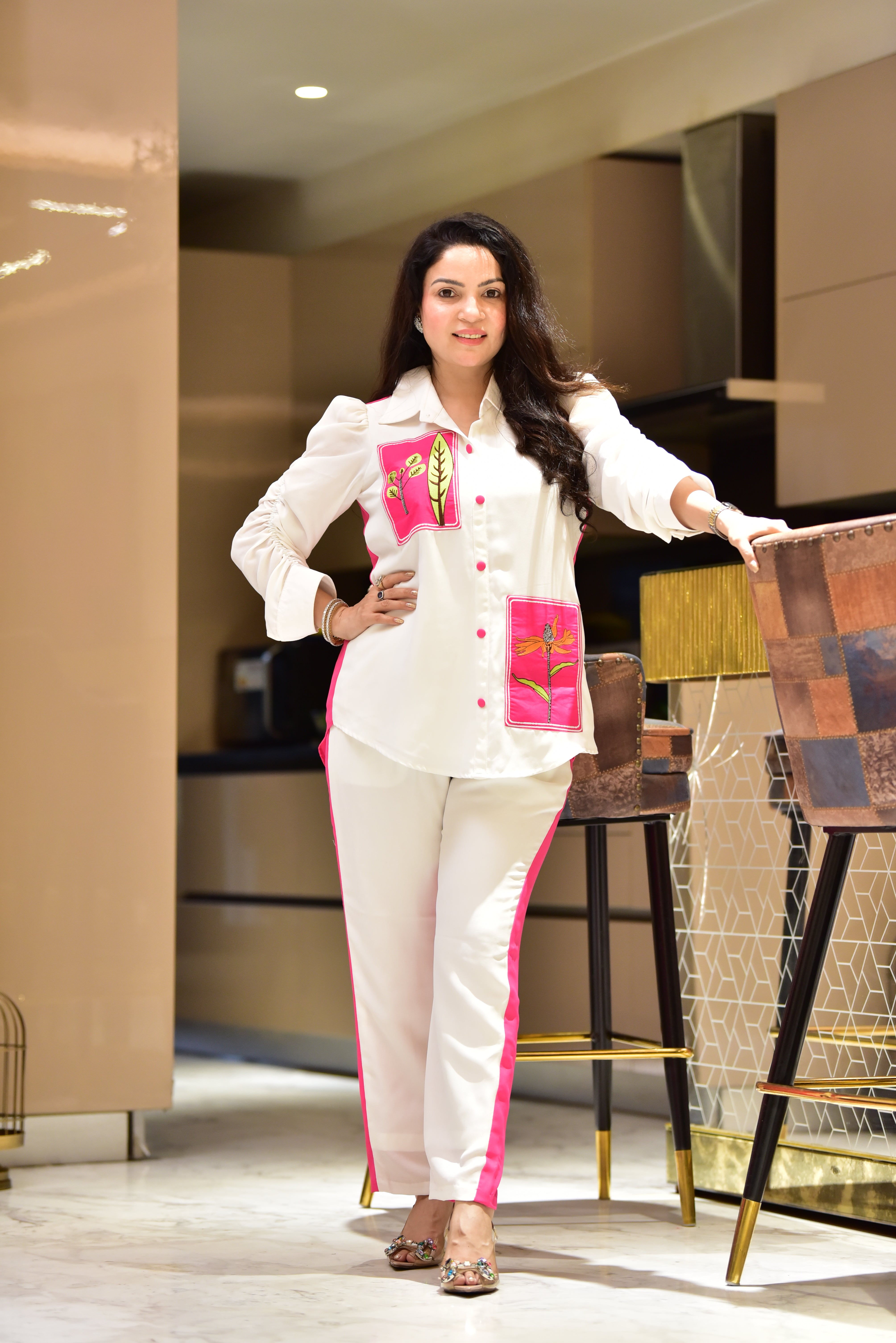 No. of components - 2- shirt & pants , Fabric - Georgette , Color - Pink & white, work - Machine work, Fit - According to measurements