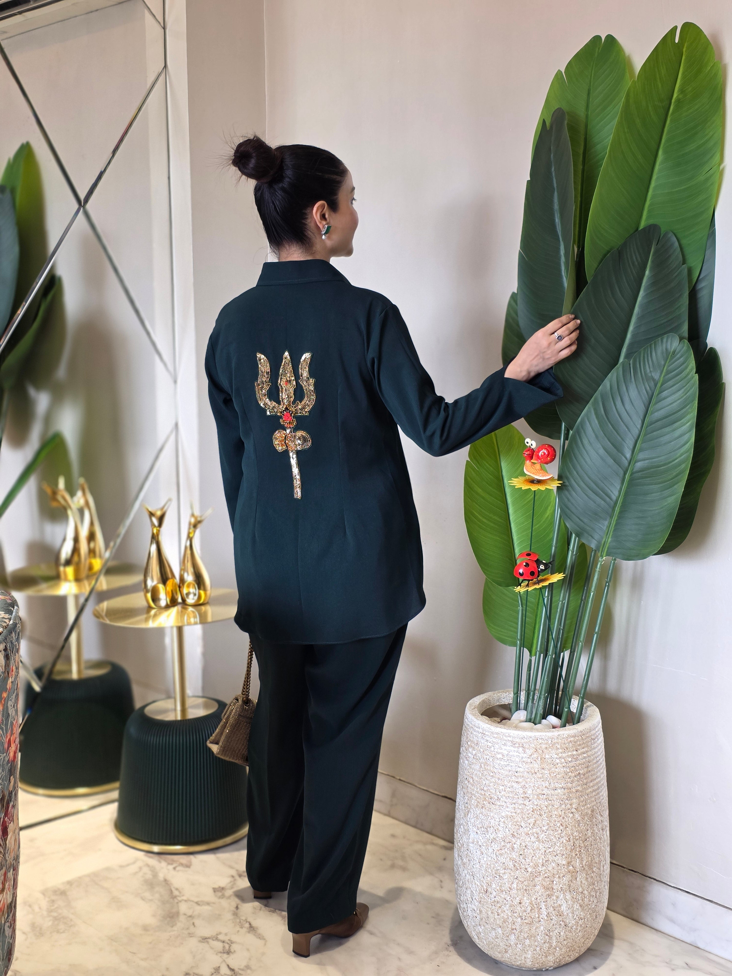 No. of components - 2: top and pants, Fabric - cotton Lycra , Color - emrald green, work - handwork, Fit - According to measurements