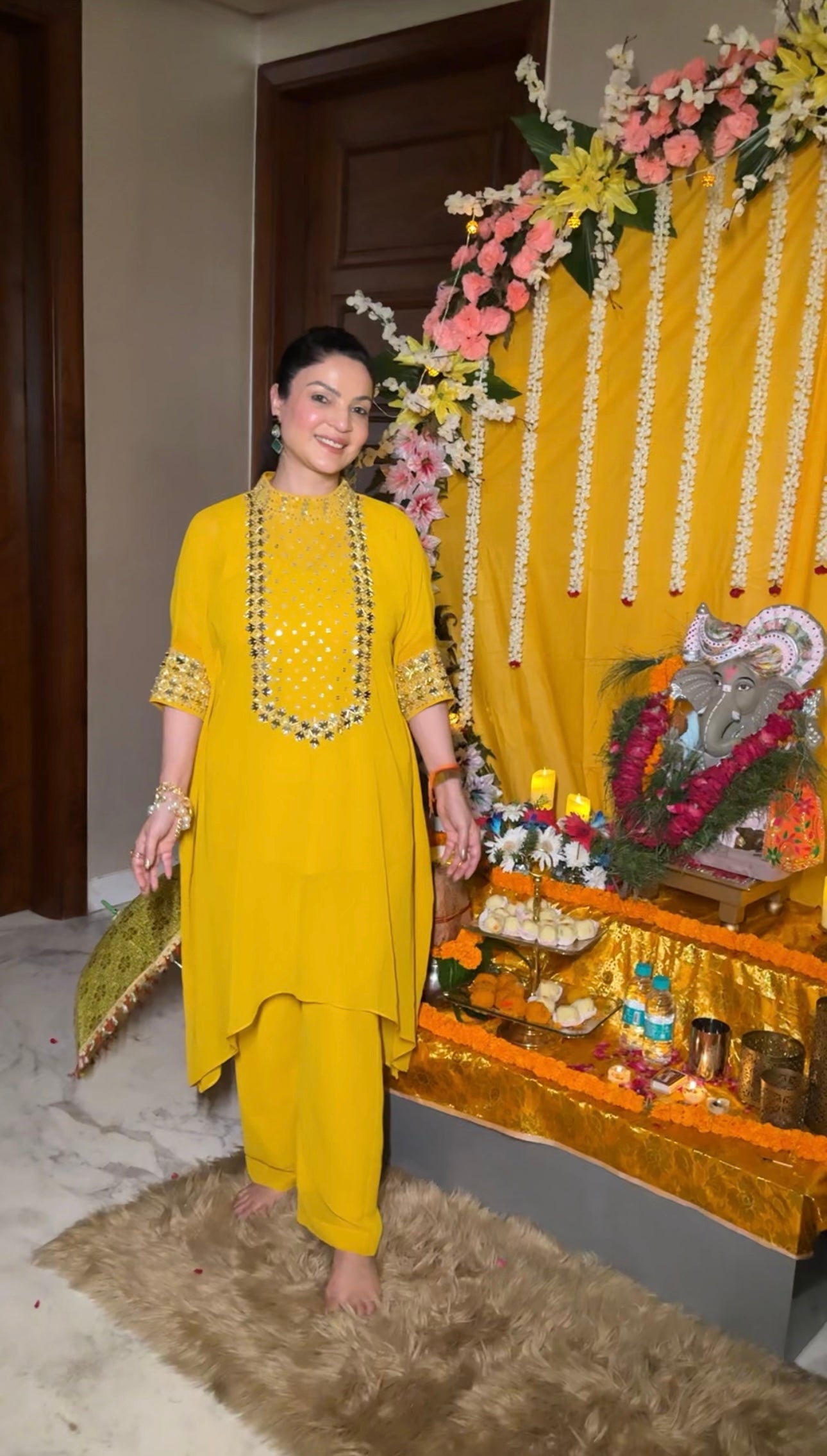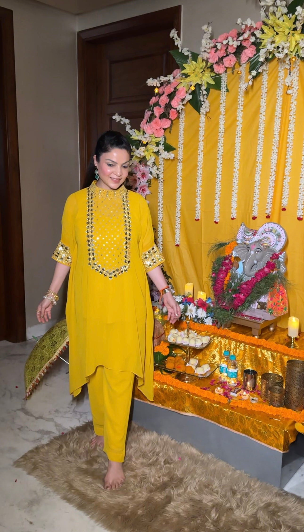 No. of components - 2 high low kurti & pants , Fabric - georgette , Color - yellow, work - Handwork: mirror work, Fit - According to measurements
