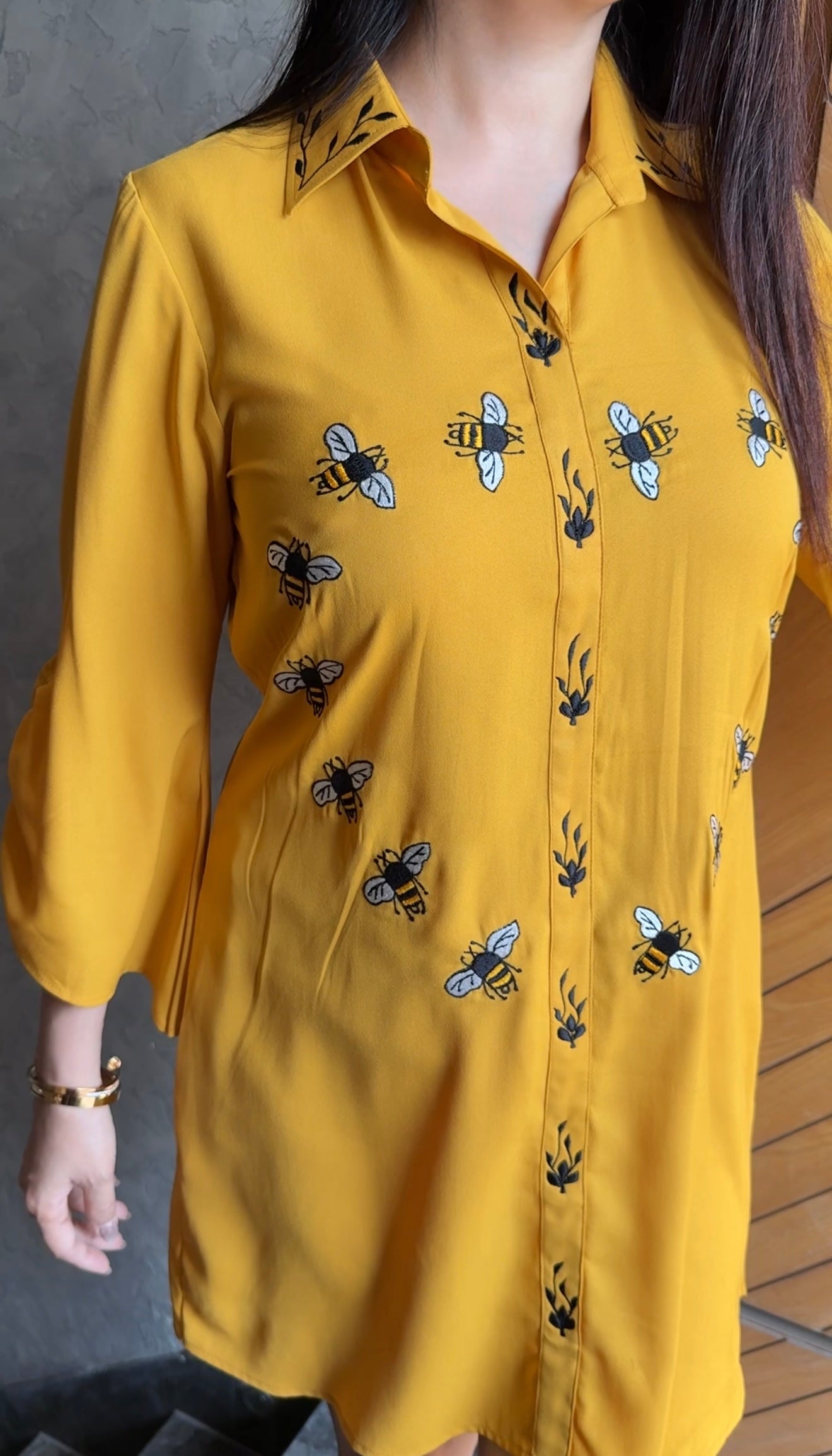 No. of components - 1 Shirt dress , Fabric - crepe, Color - yellow, work - machine work, Fit - According to measurements