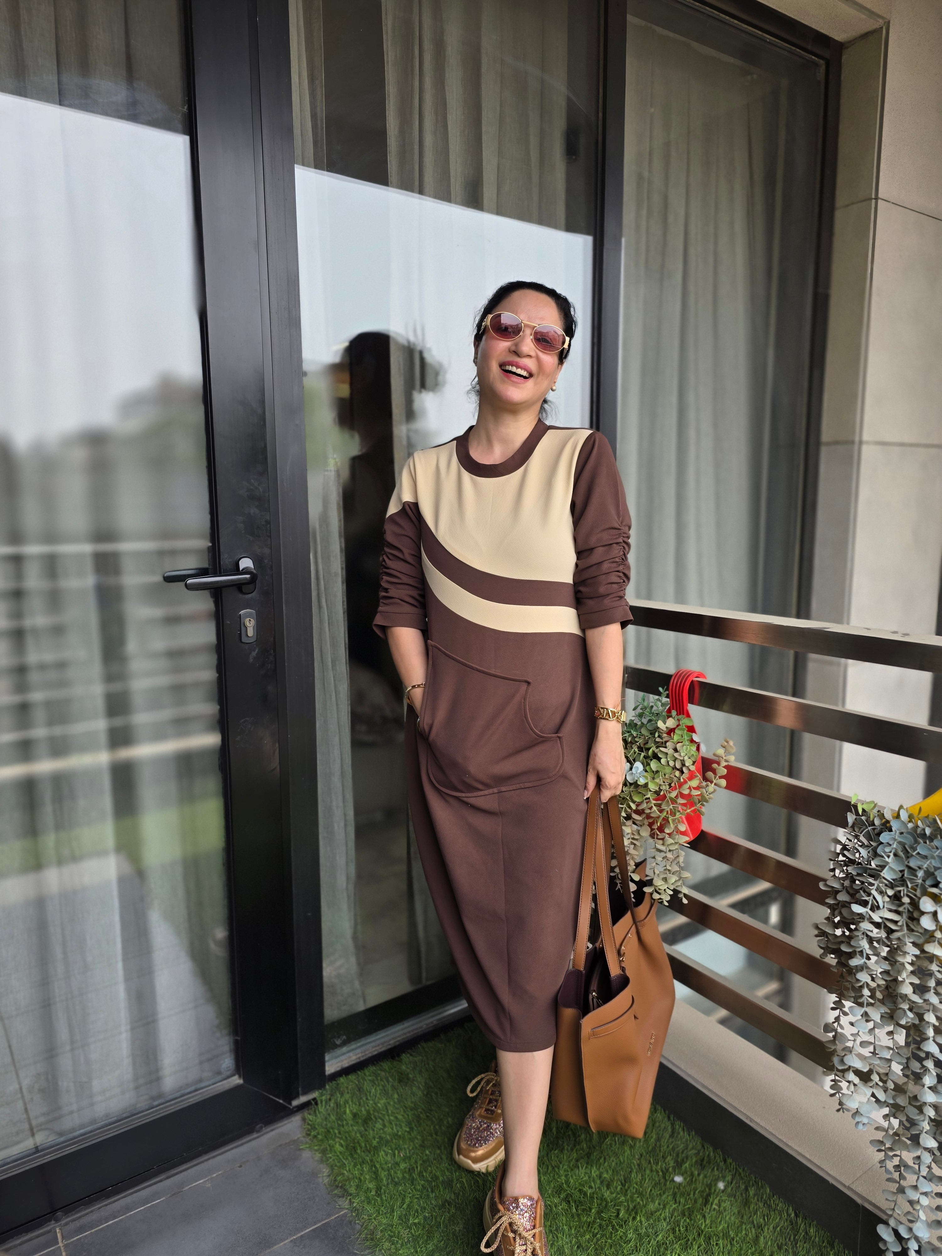 No. of components - 1 Dress , Fabric - hosiery, colour- brown & beige, Fit - According to measurements