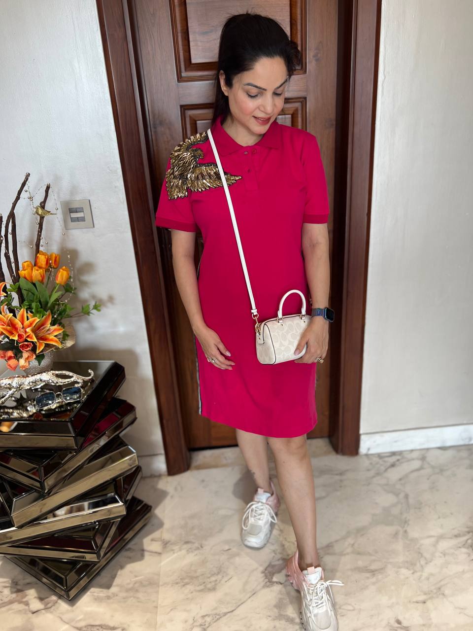 This t-shirt dress offers a vibrant pop of color with its hot pink hue and standout eagle embroidery. Crafted from durable polyester cotton hosiery matte fabric, the dress features a spread collar for a stylish finish. Perfect for adding a personalized flair to any wardrobe.