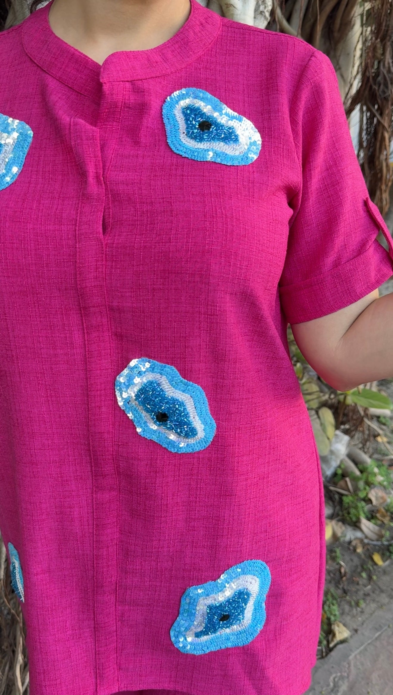 No. of components - 2 : top & pants, Fabric - Cotton linen , Color - hot pink, work - handwork, Fit - According to measurements