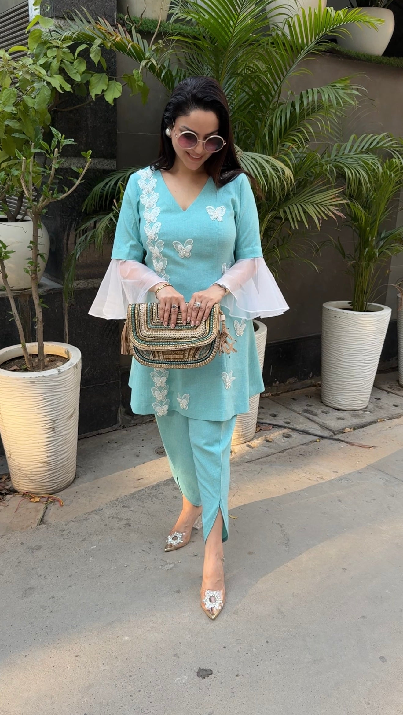 No. of components - 2 : top & tulip pants, Fabric - Cotton linen , Color - aqua blue, work - handwork, Fit - According to measurements