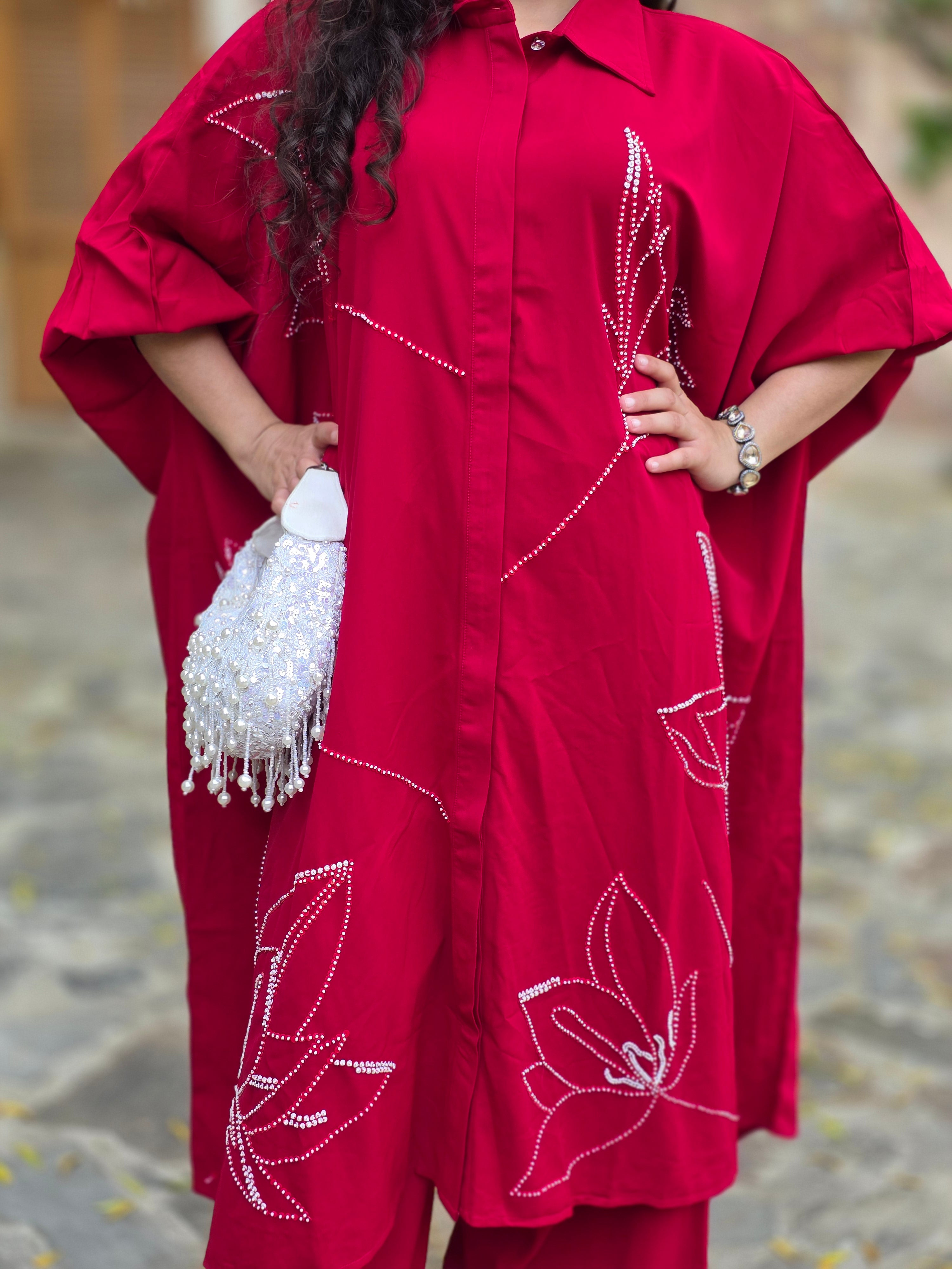 No. of components - 2: A-line kurta & pants, Fabric - crepe , Color - red, work - handwork, Fit - According to measurements