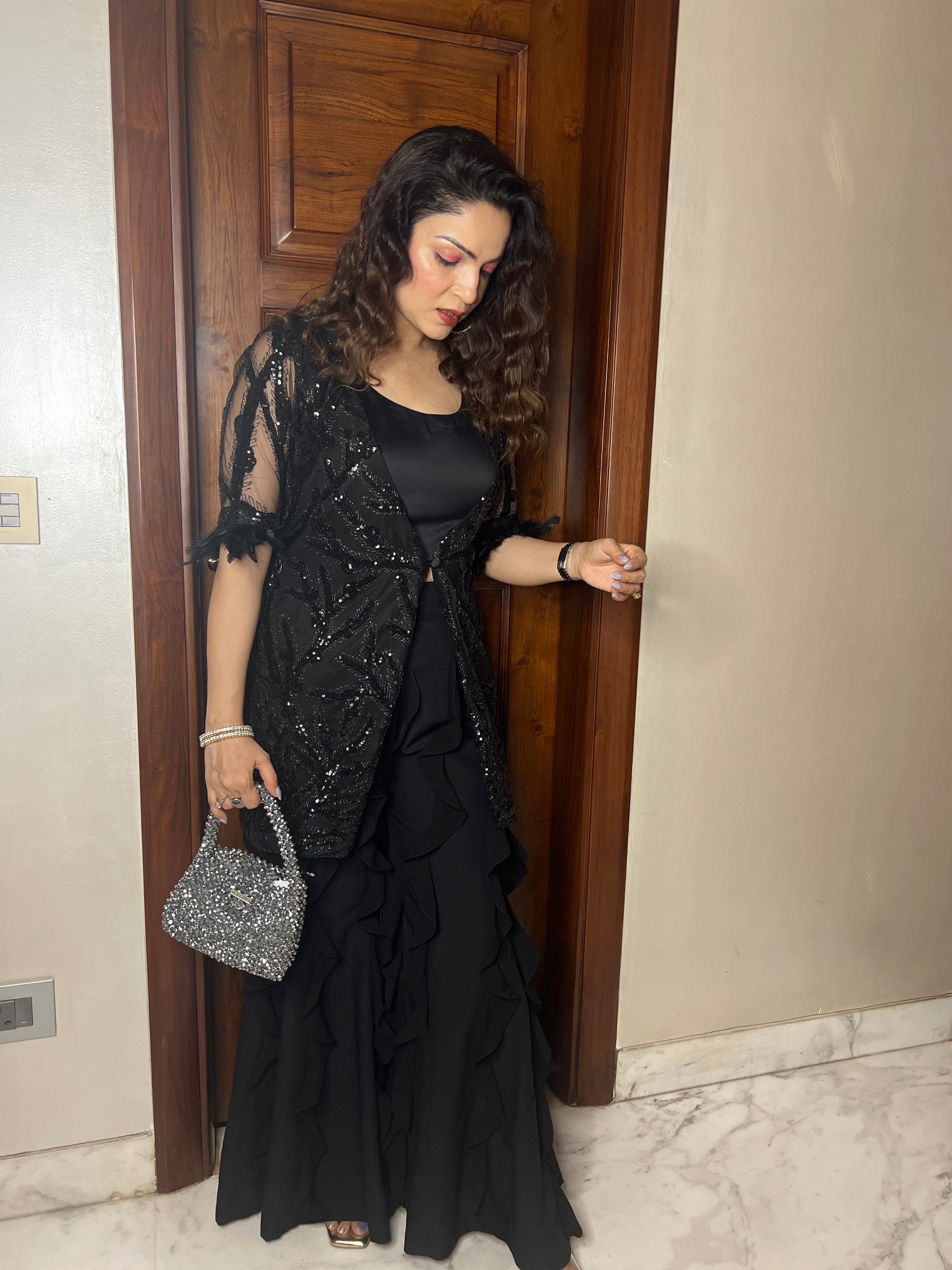 Fabric : Embroidered Jacket with georgette crop top & hipster pants