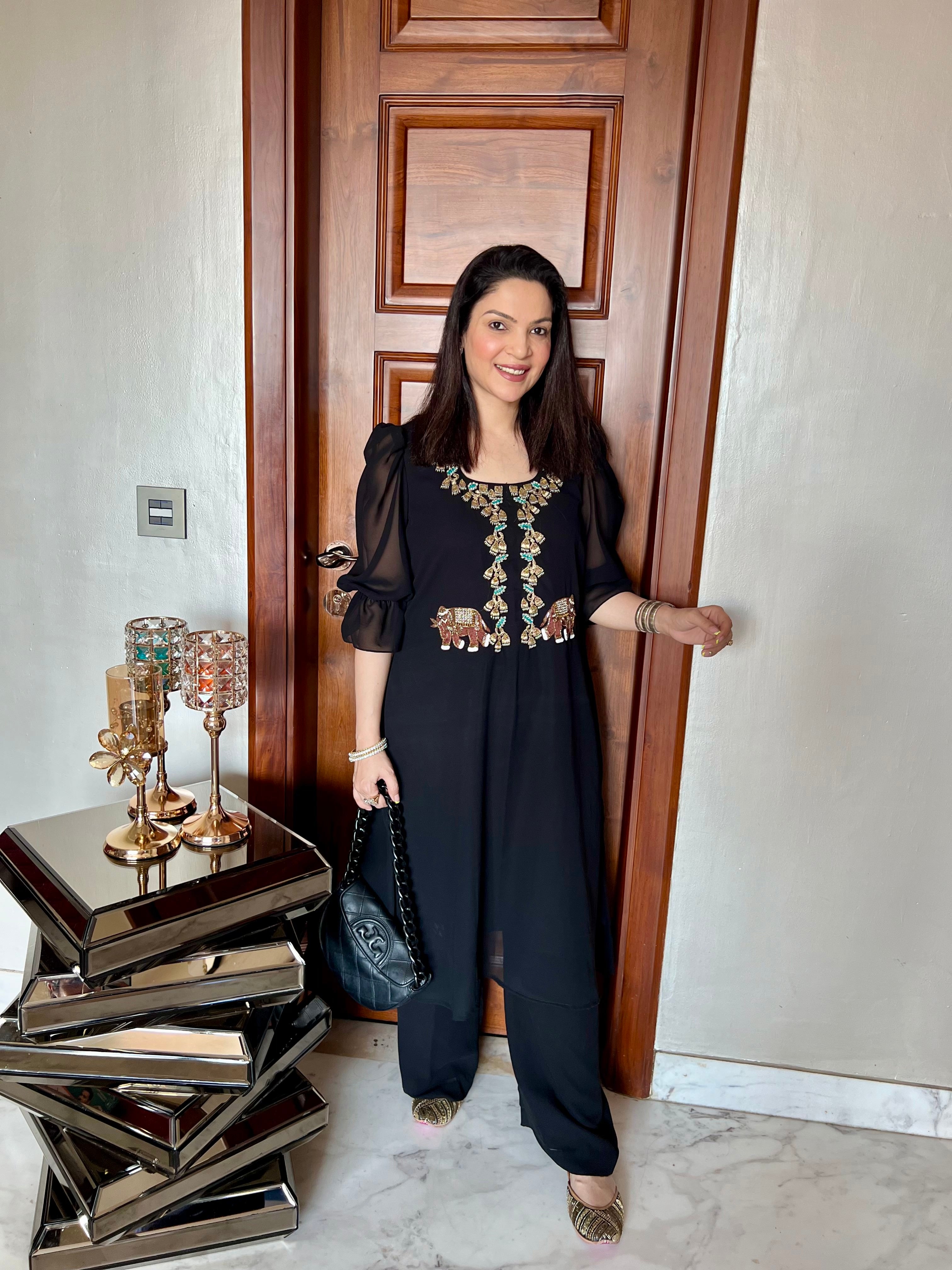 NO. OF COMPONENTS - 2COMPONENTS - Kurta & PantsFABRIC - GeorgetteCOLOUR - BlackWORK - Hand workFIT -...
