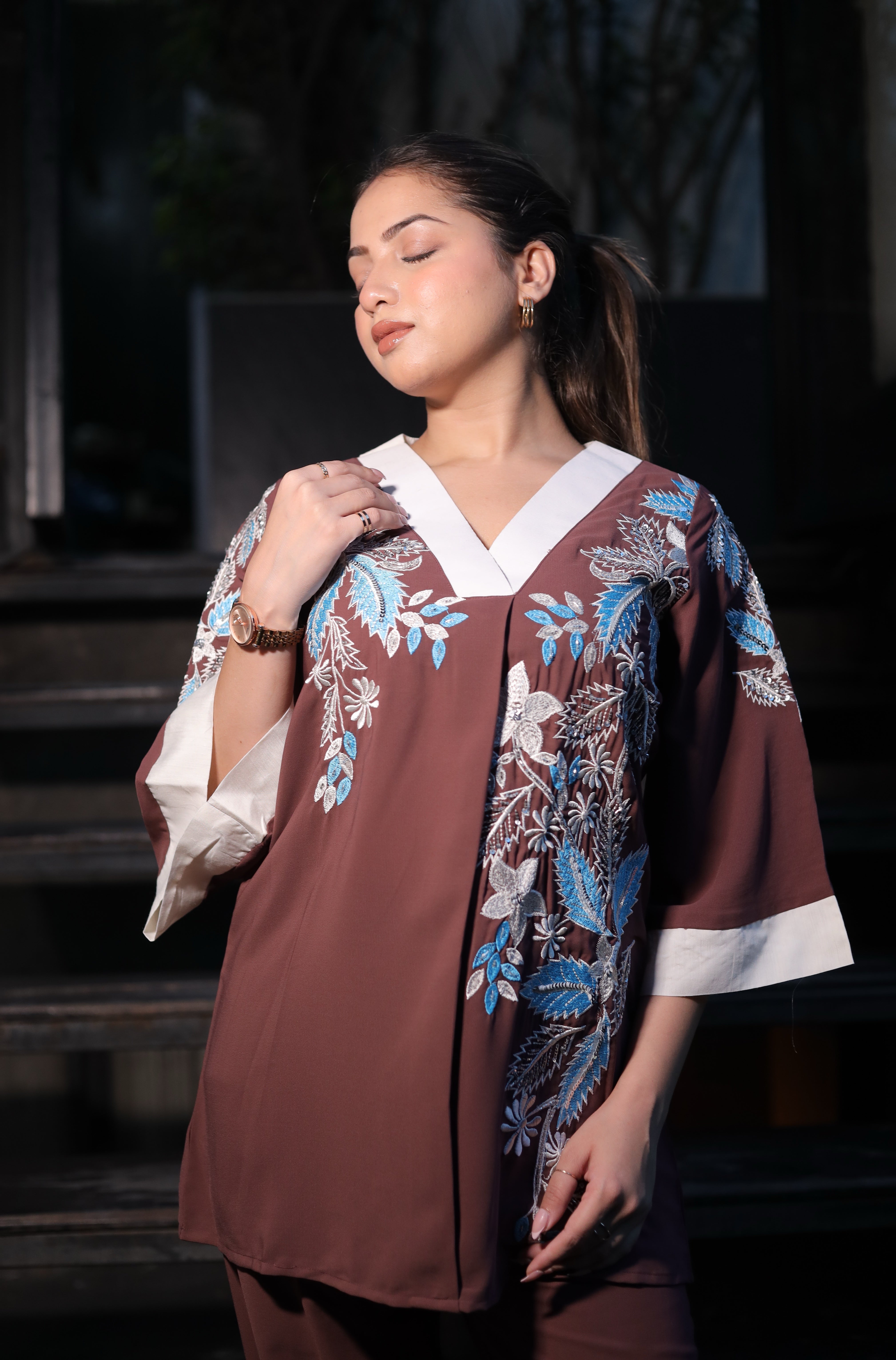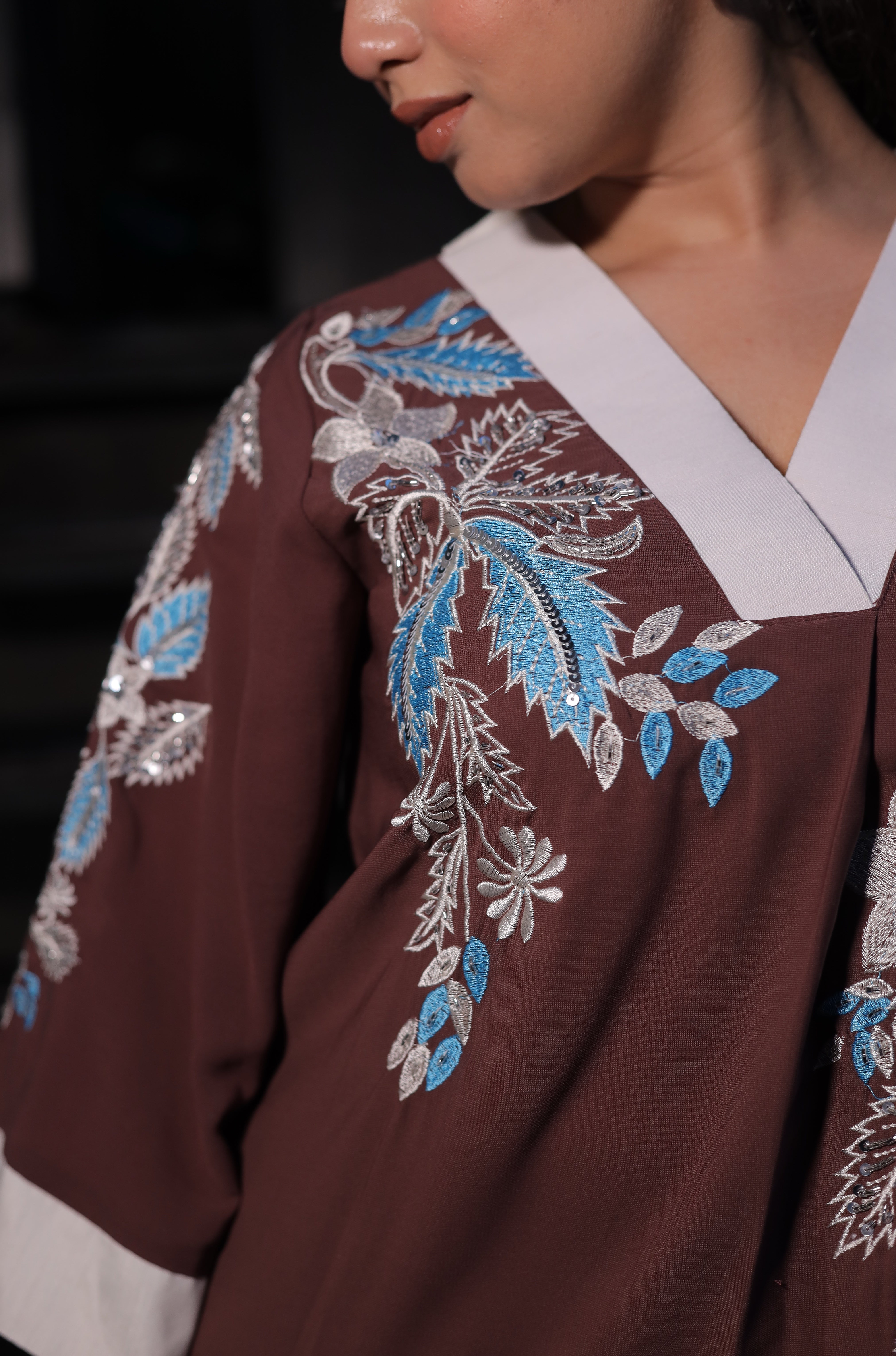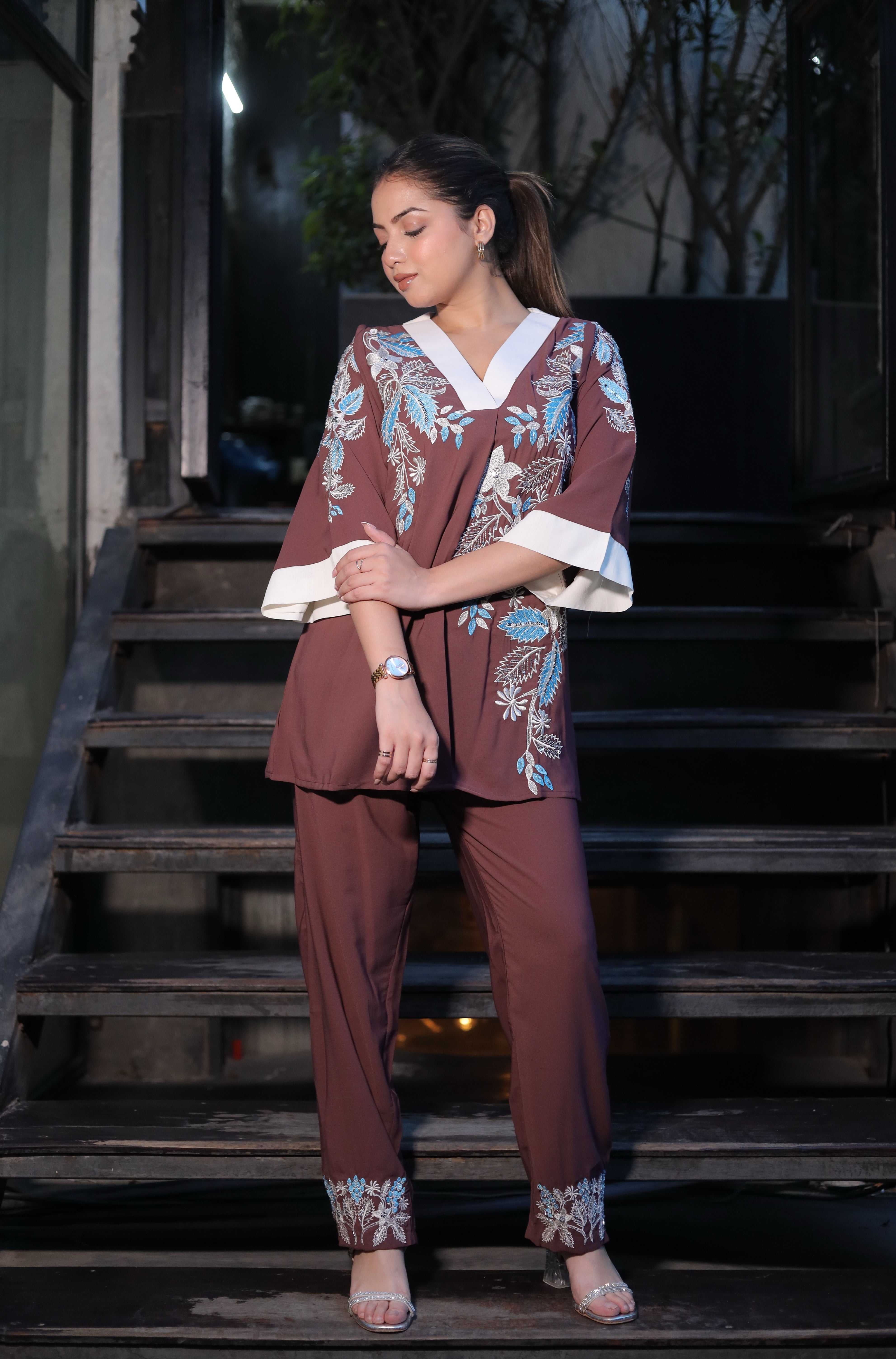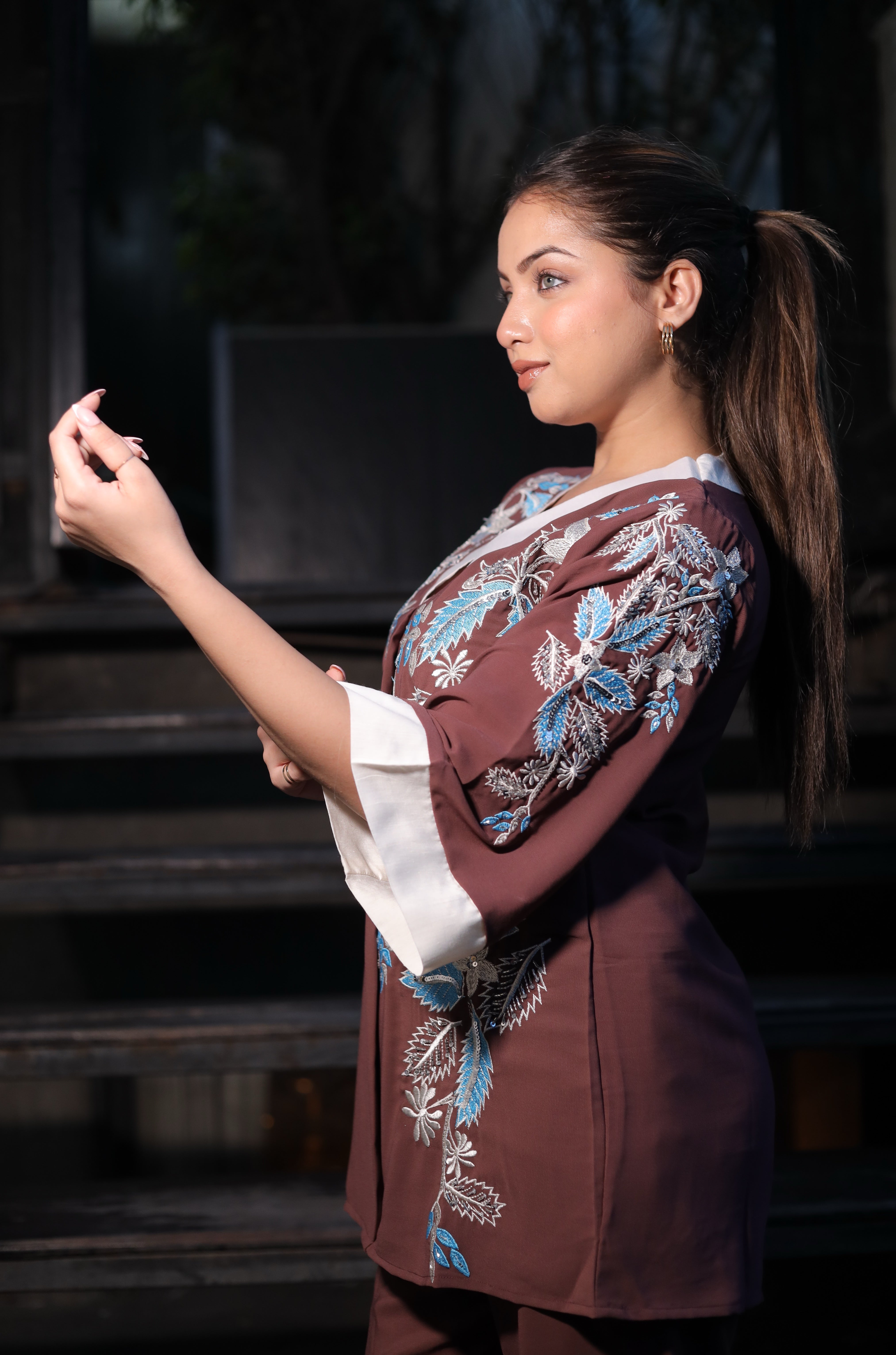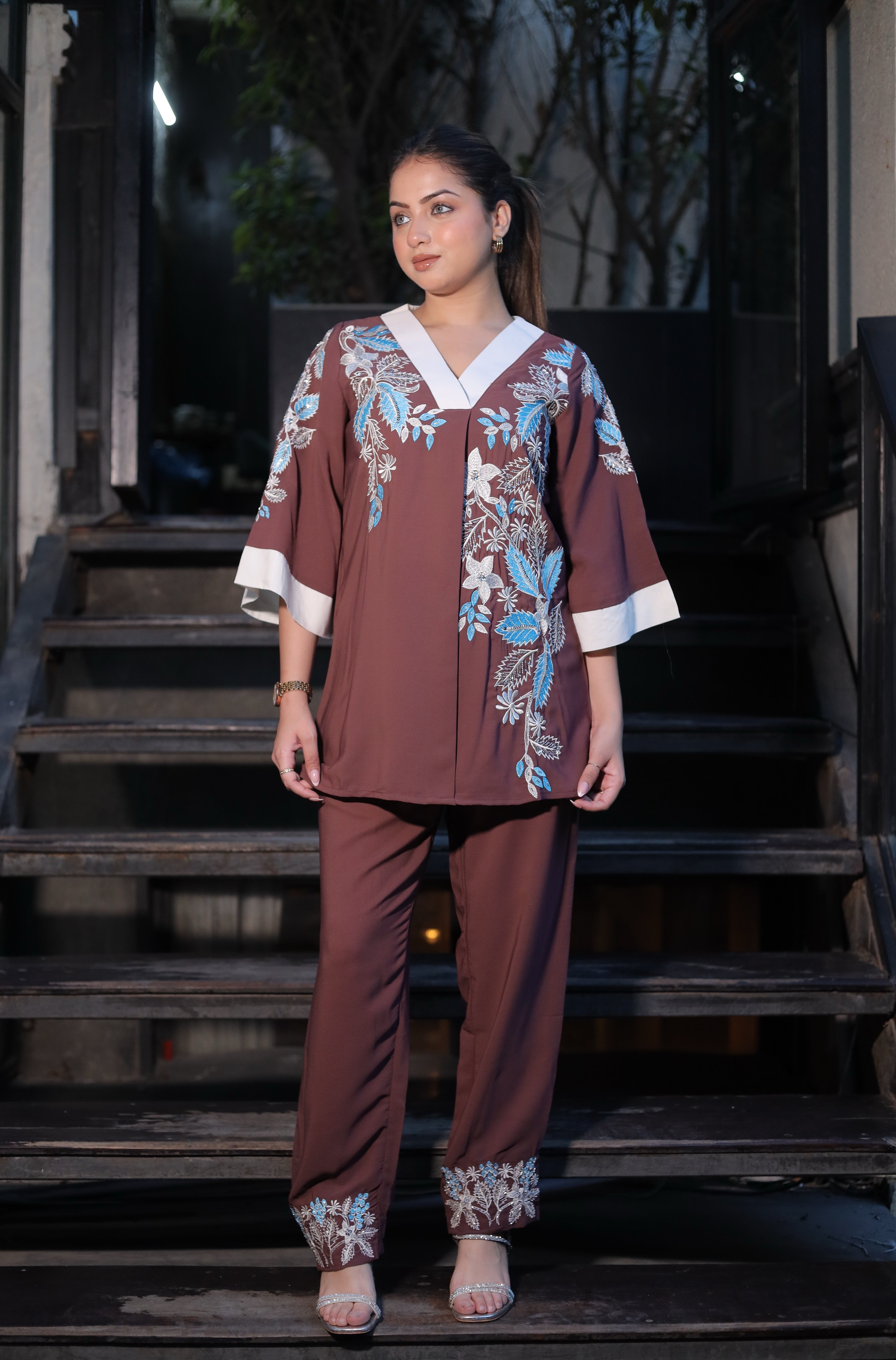 No. of components - 2: top & pants , Fabric - georgette , Color - brown, work - machine work, Fit - According to measurements