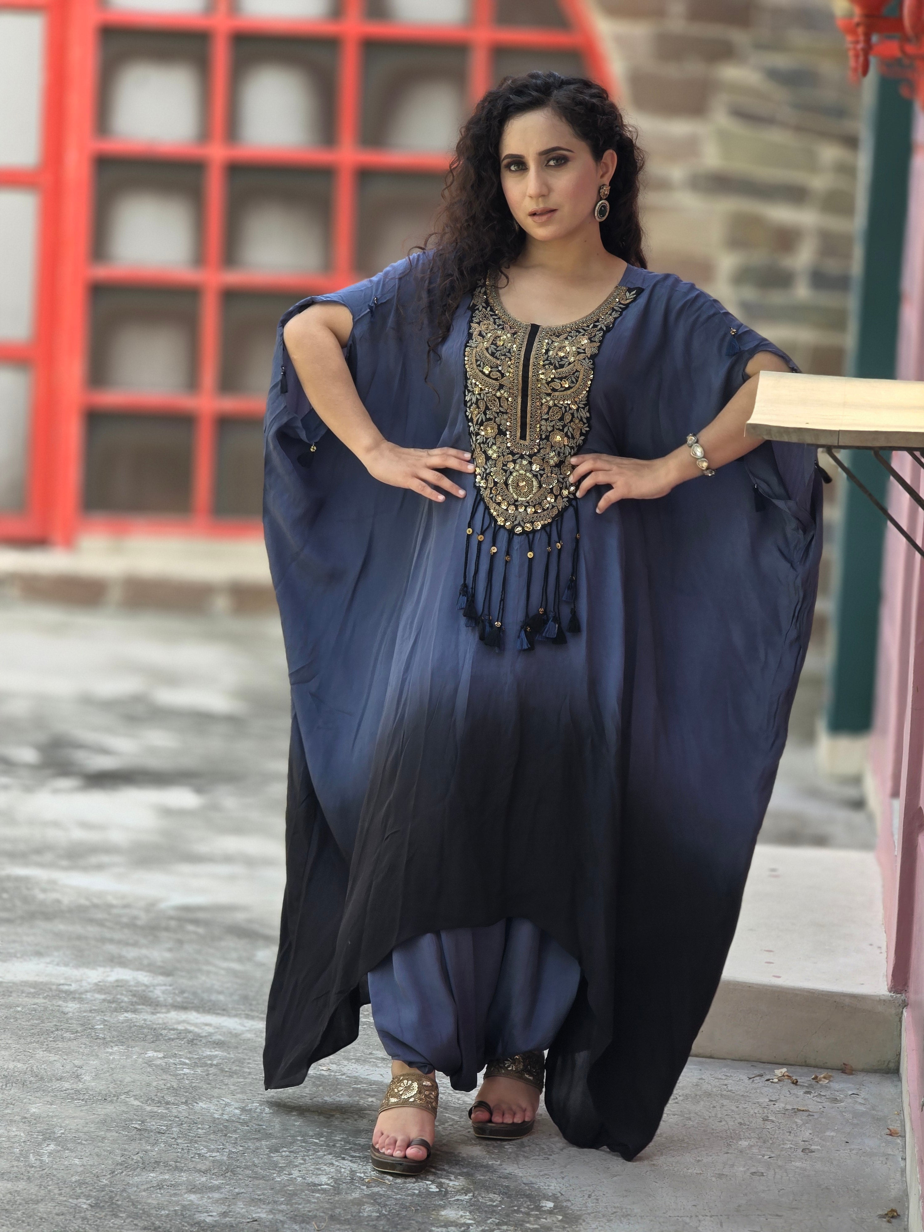No. of components - 2: kurta & dhoti drape, Fabric - satin , Color - black, work - handwork, Fit - According to measurements