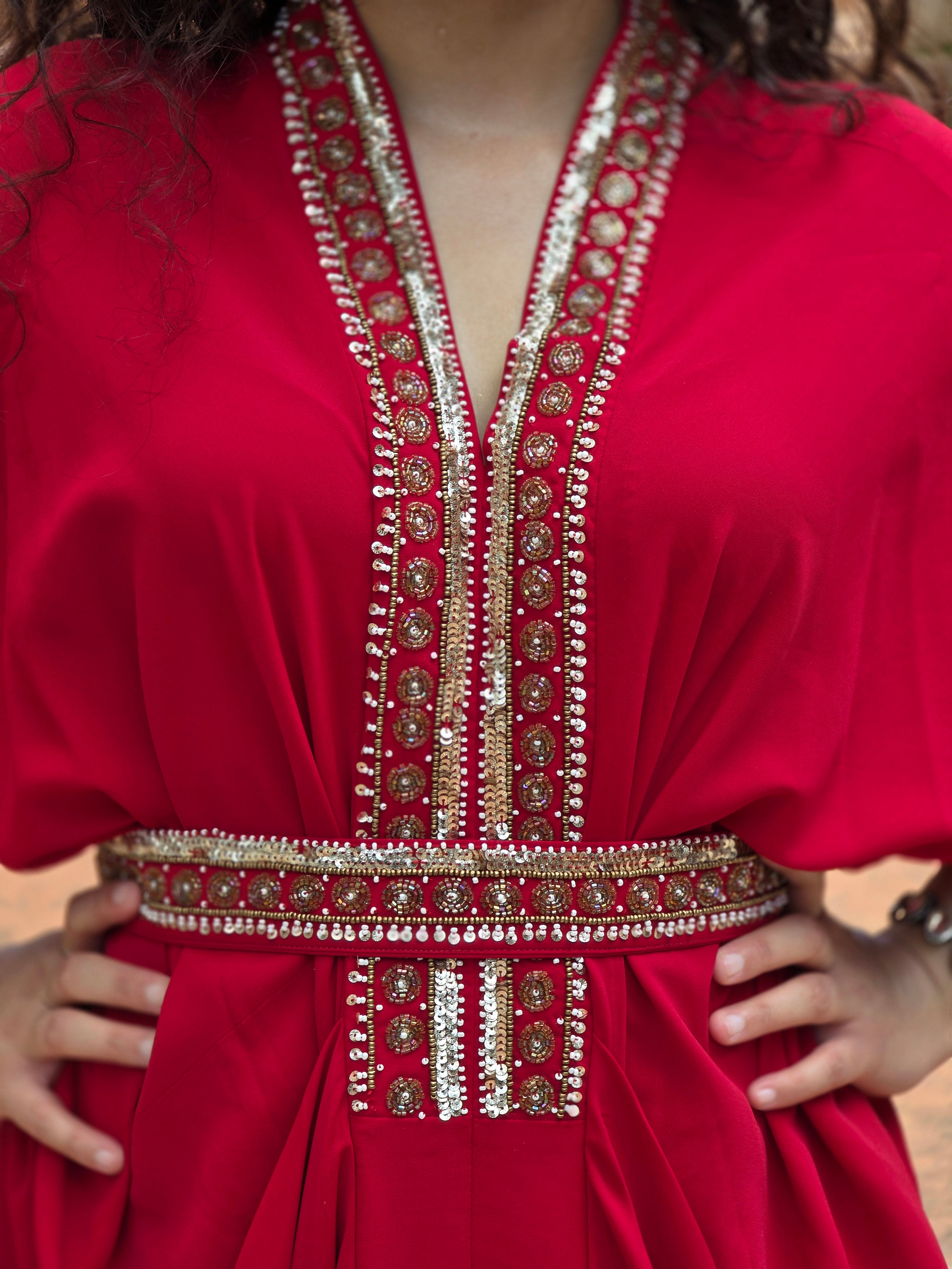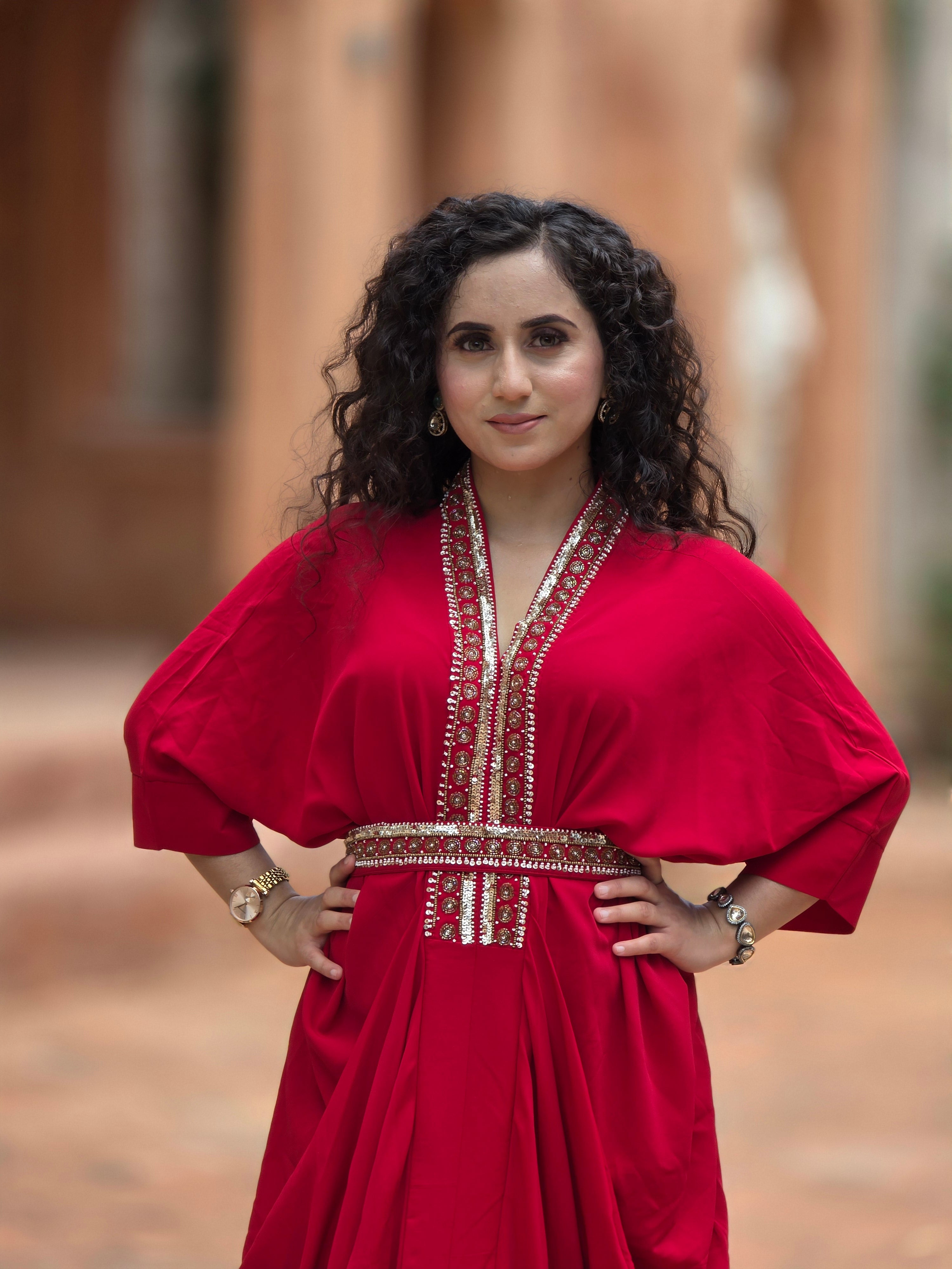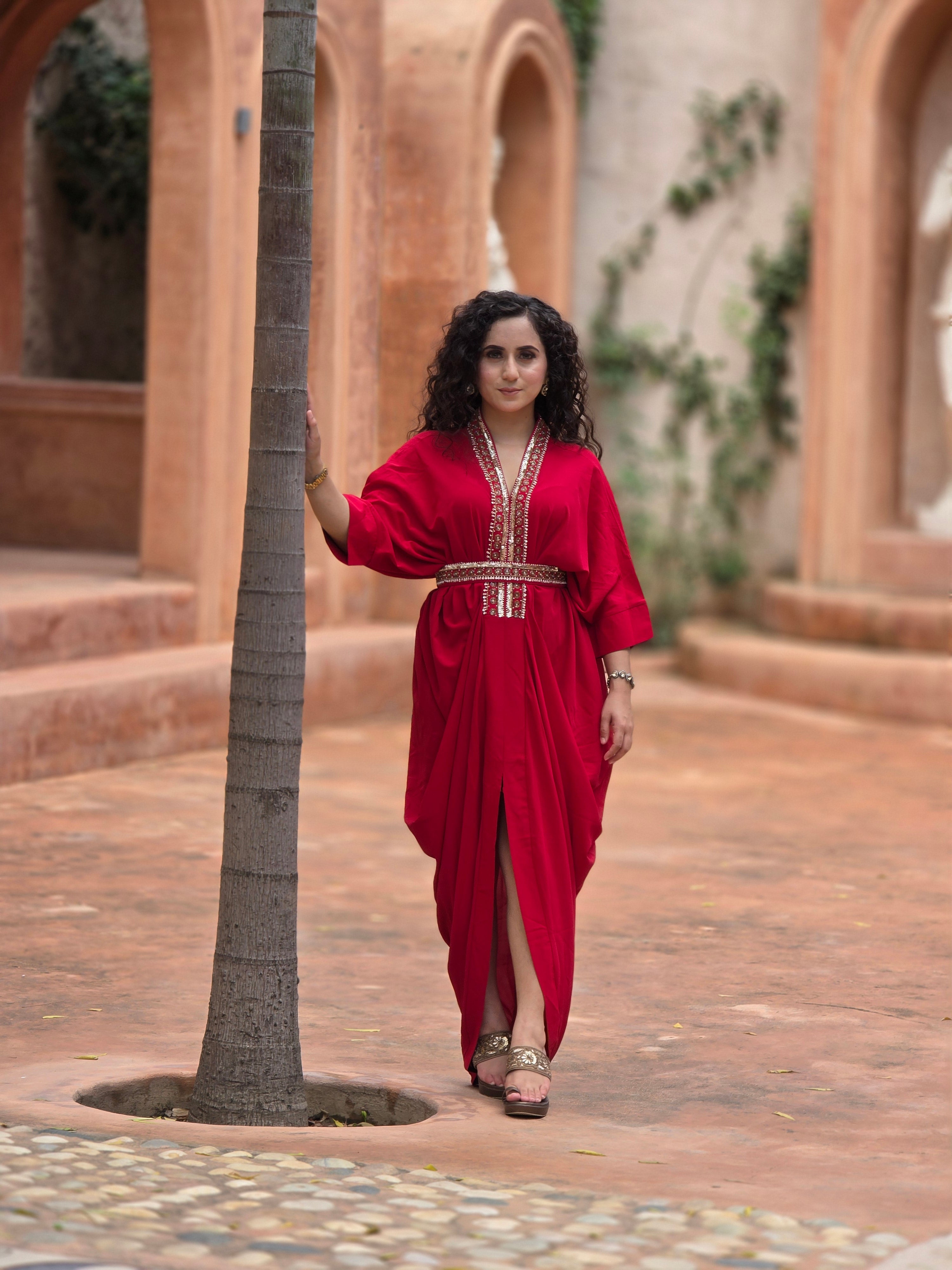 No. of components - 2: drape & belt, Fabric - satin , Color - red, work - handwork, Fit - According to measurements