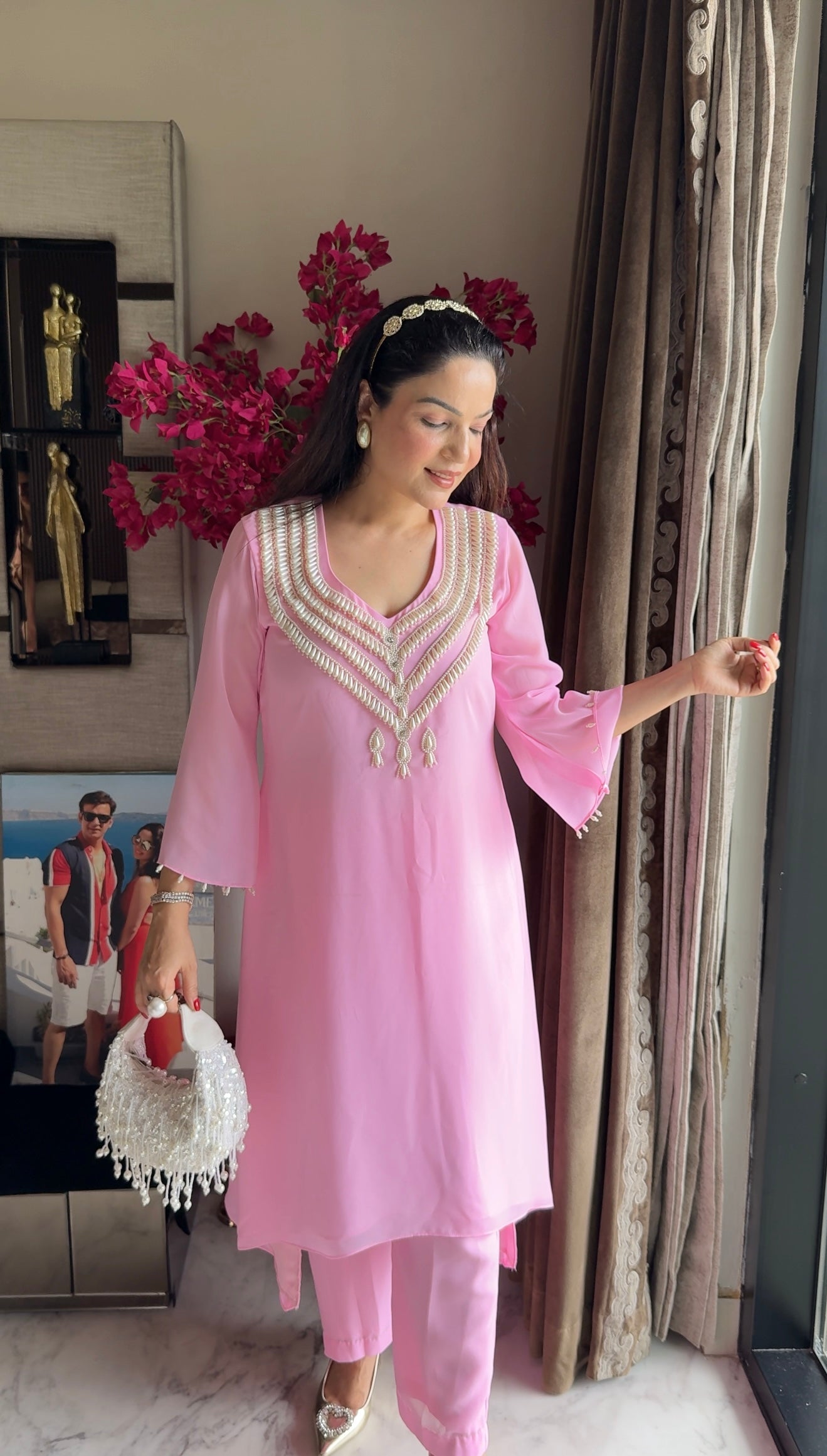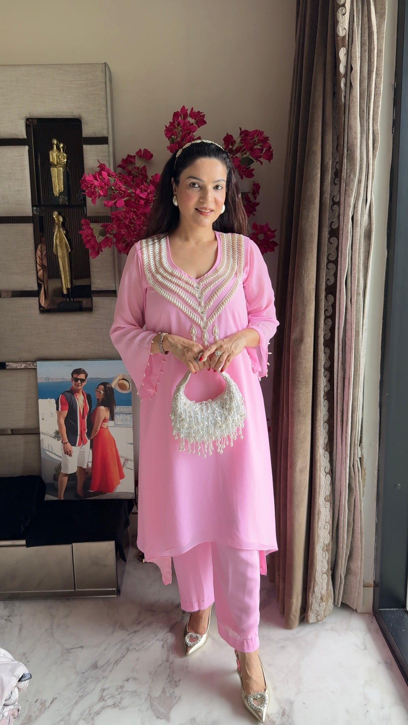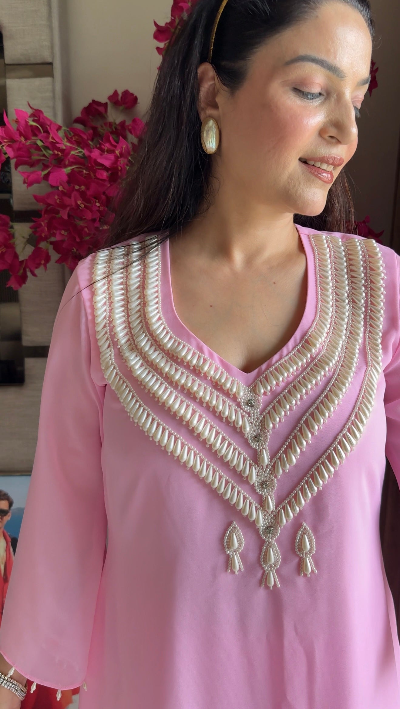 No. of components - 2 : kurta & pants, Fabric - crepe , Color - baby pink, work: Pearl work detailing, Fit - According to measurements
