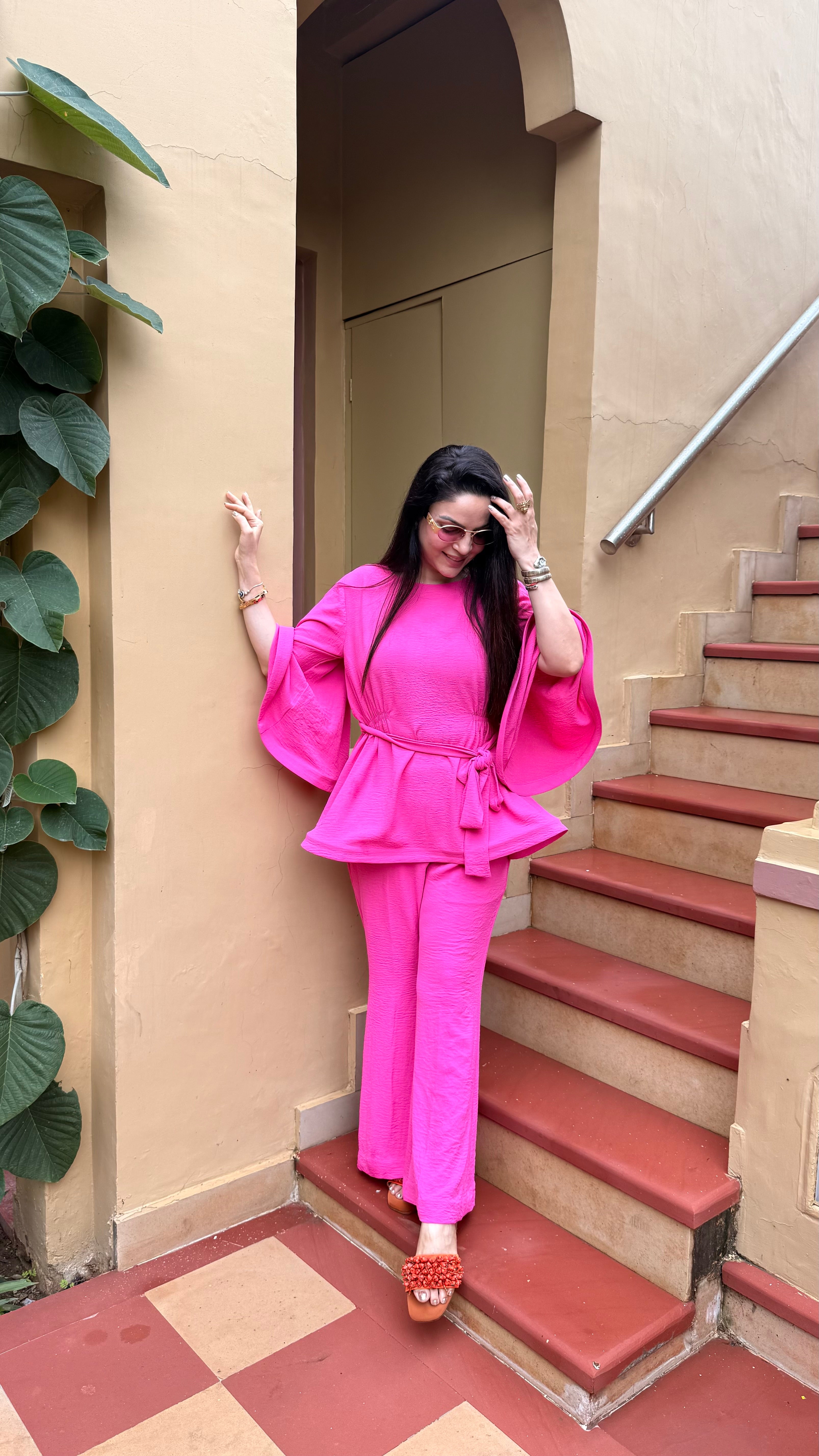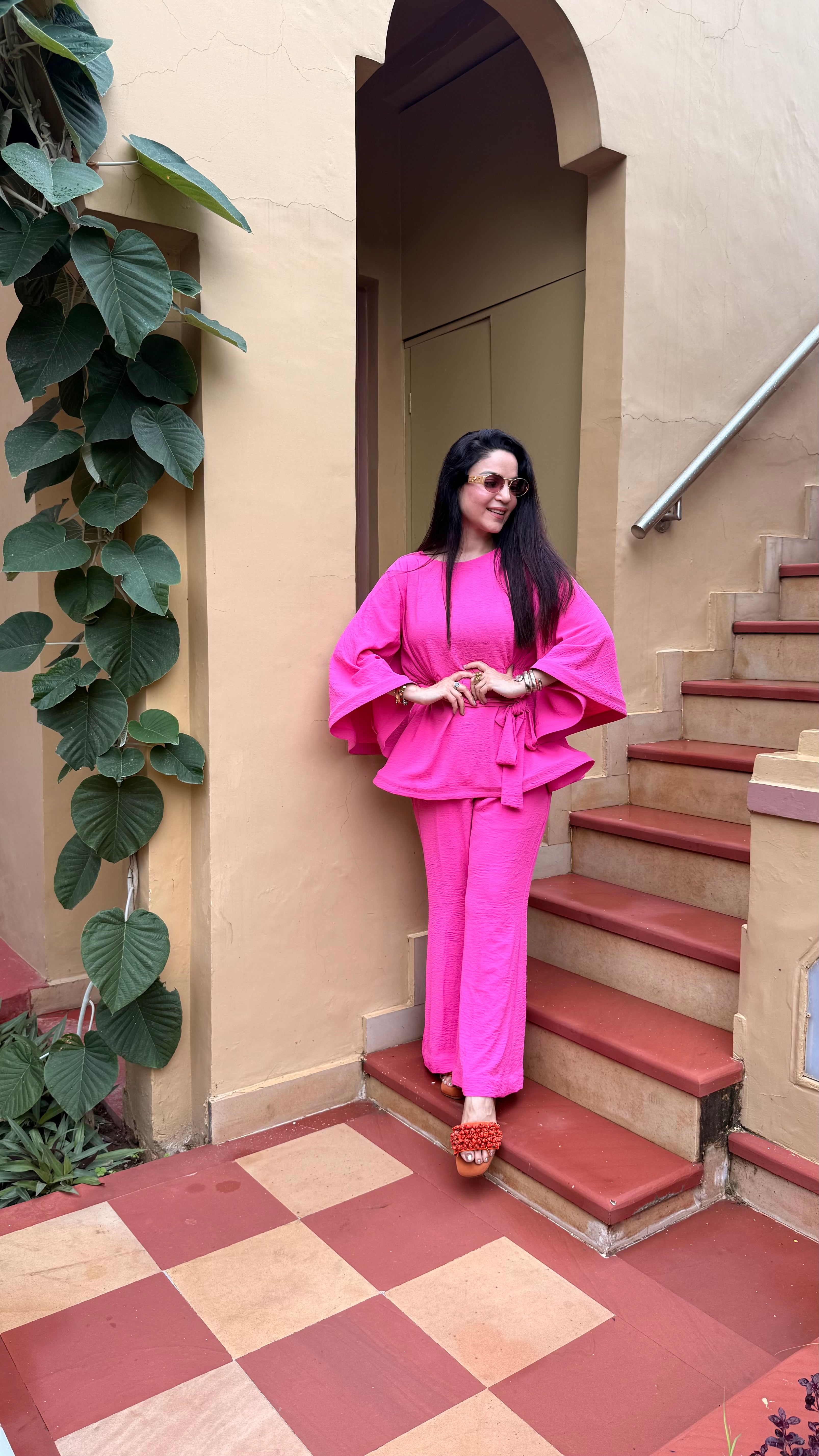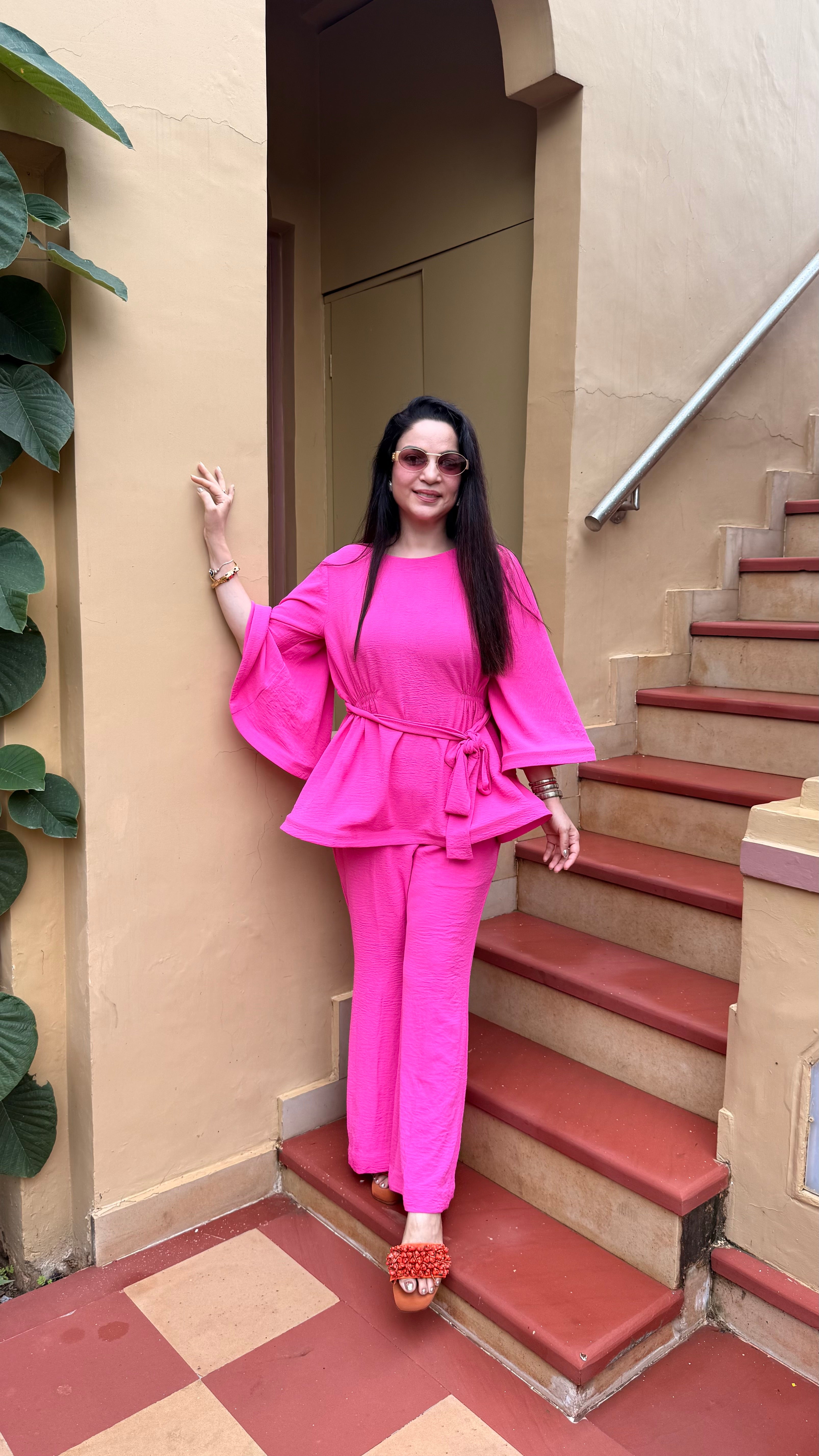 No. of components - 2: top and pants, Fabric - cotton Lycra , Color - pink, Fit - According to measurements