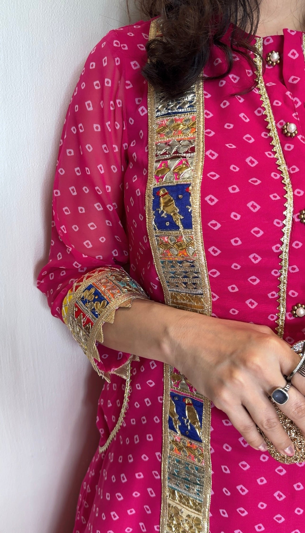 No. of components - 2: Kurti & pants, Fabric - Pure Crepe, Color - Pink, work - Handwork, Fit - According to measurements