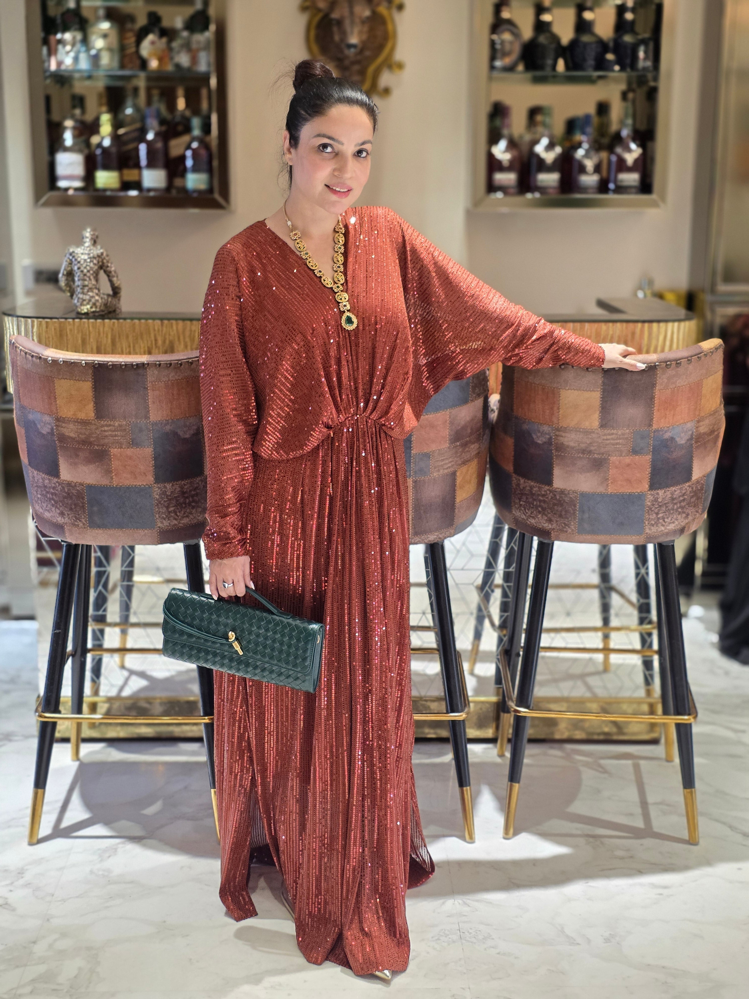 No. of components - 1 kaftan, Fabric - sequins fabric , Color - rust, Fit - According to measurements
