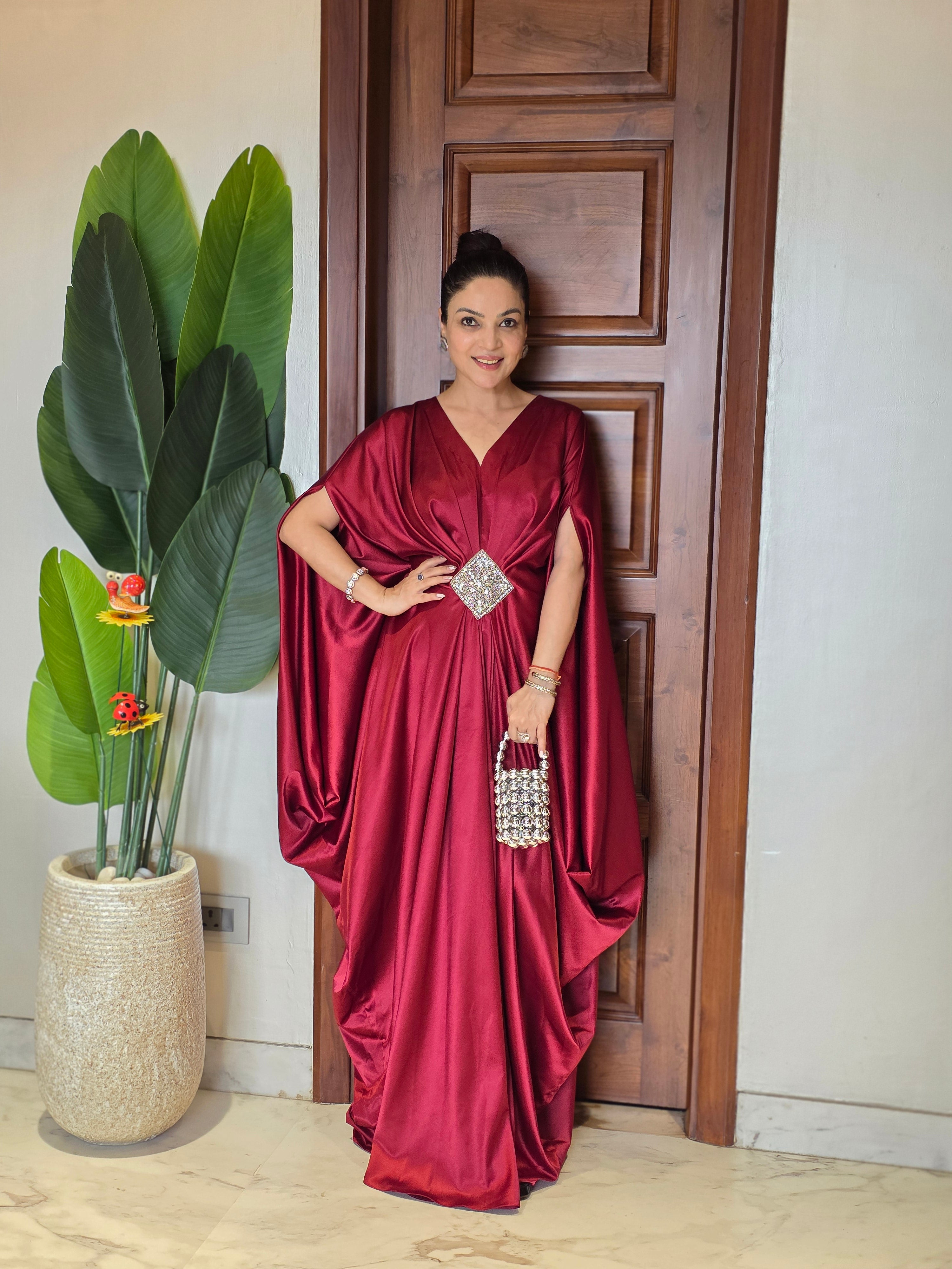No. of components - 1 kaftan, Fabric - imported satin , Color - maroon, work - handwork, Fit - According to measurements