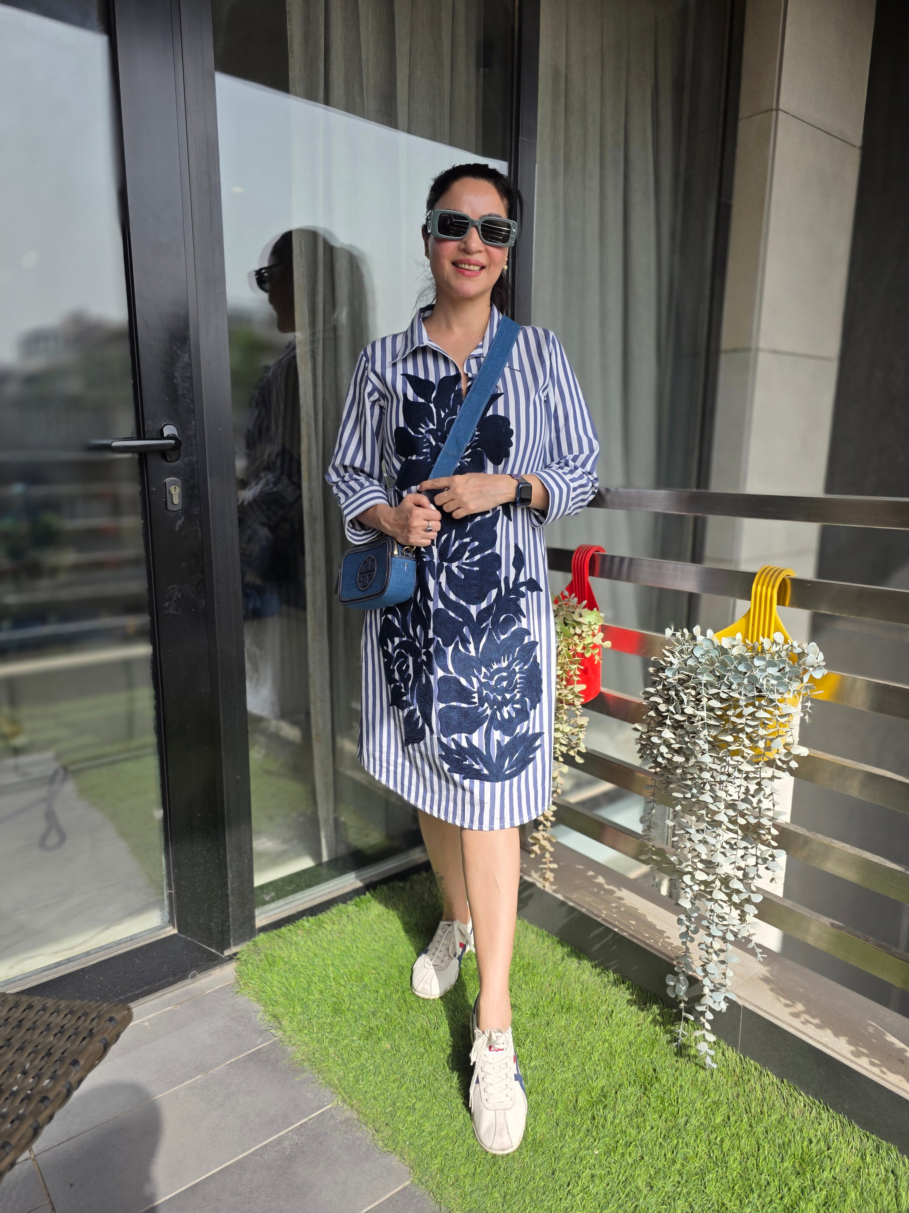 No. of components - 1 Dress , Fabric - cotton, colour- white & blue, work - machine work, Fit - According to measurements