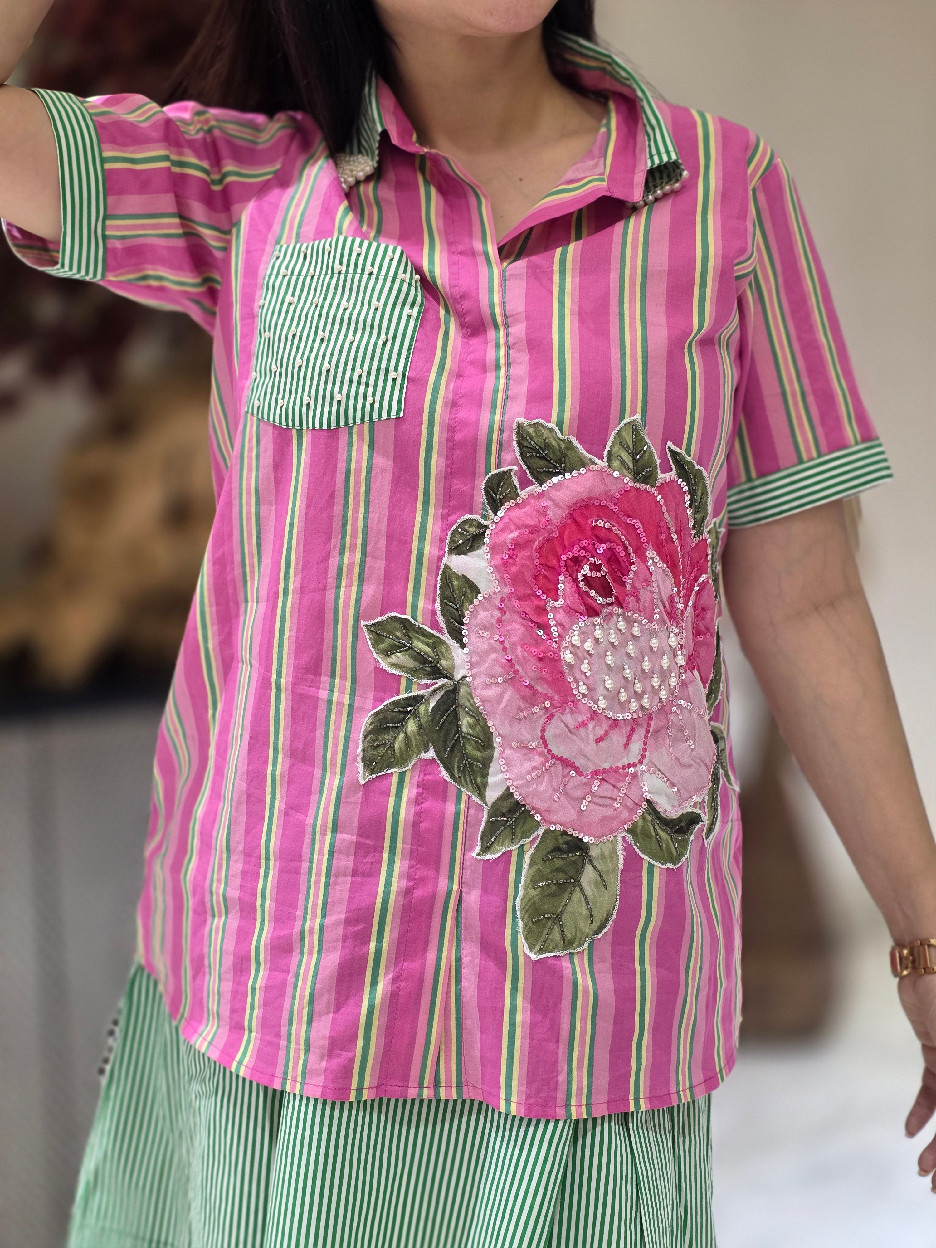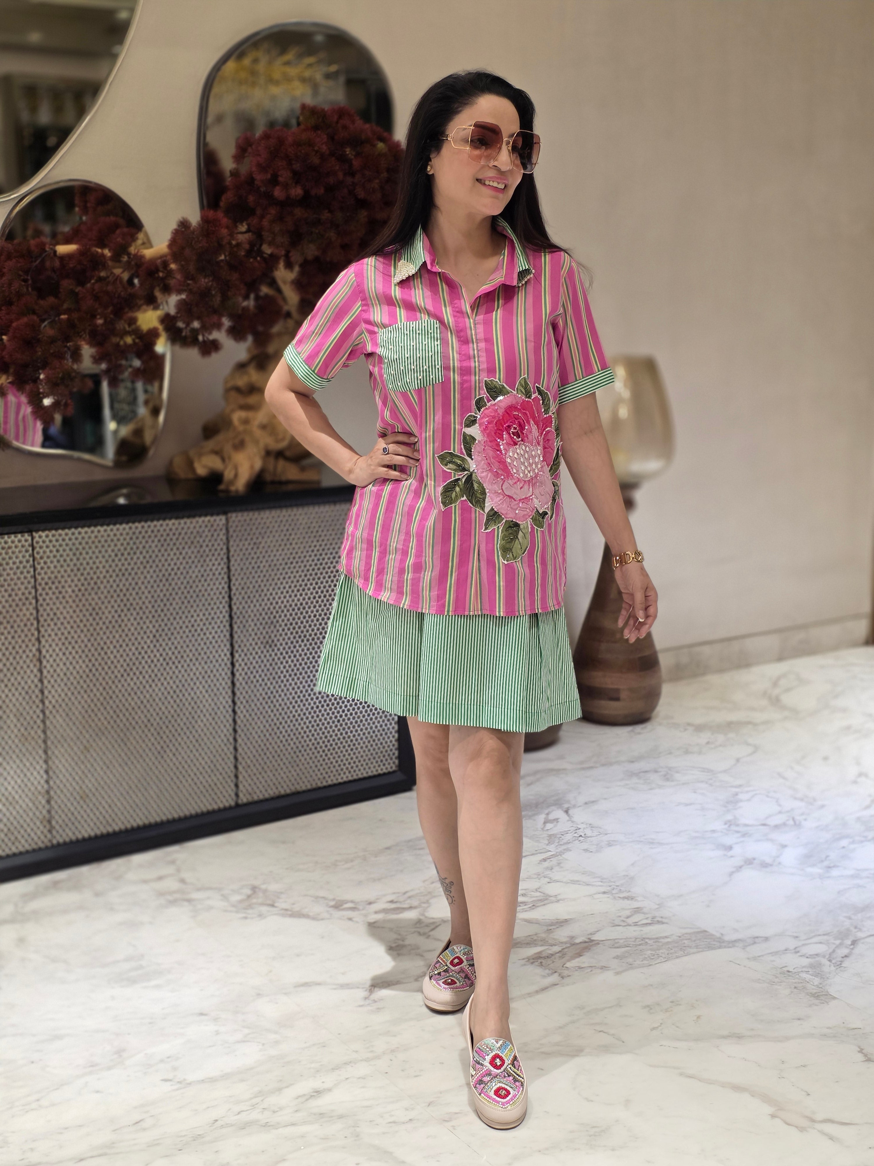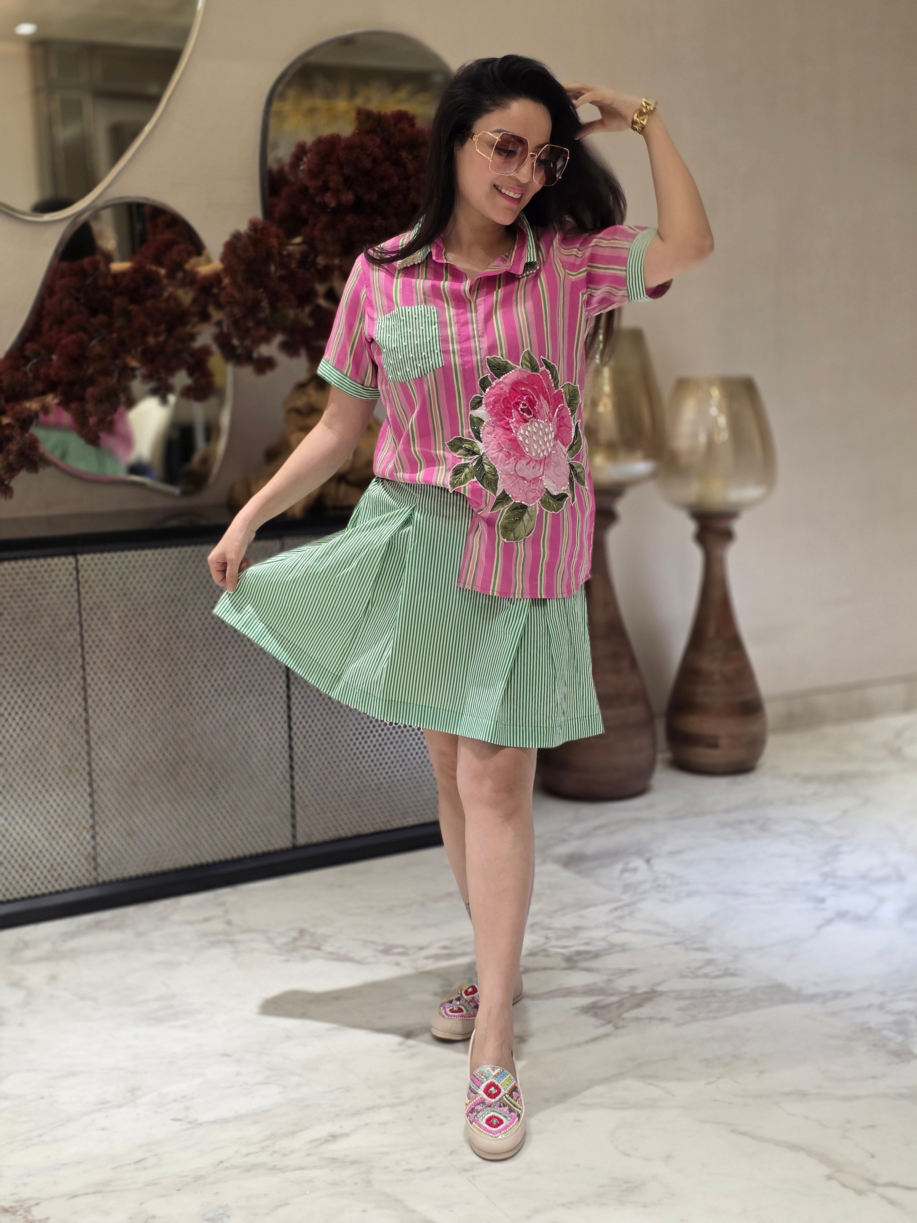No. of components - skirt & shirt , Fabric - cotton, colour- pink & green, work - handwork, Fit - According to measurements