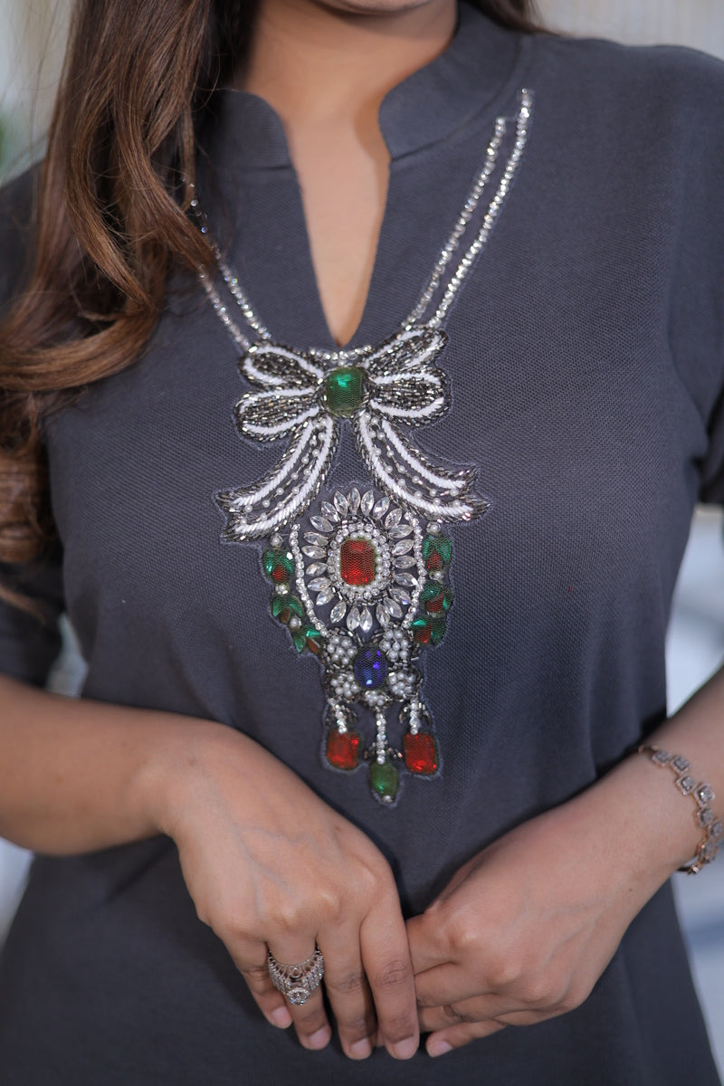 NO. OF COMPONENTS - 1COMPONENTS - DressFABRIC - Hoisery cottonCOLOUR - GreyWORK - Hand workFIT - According...