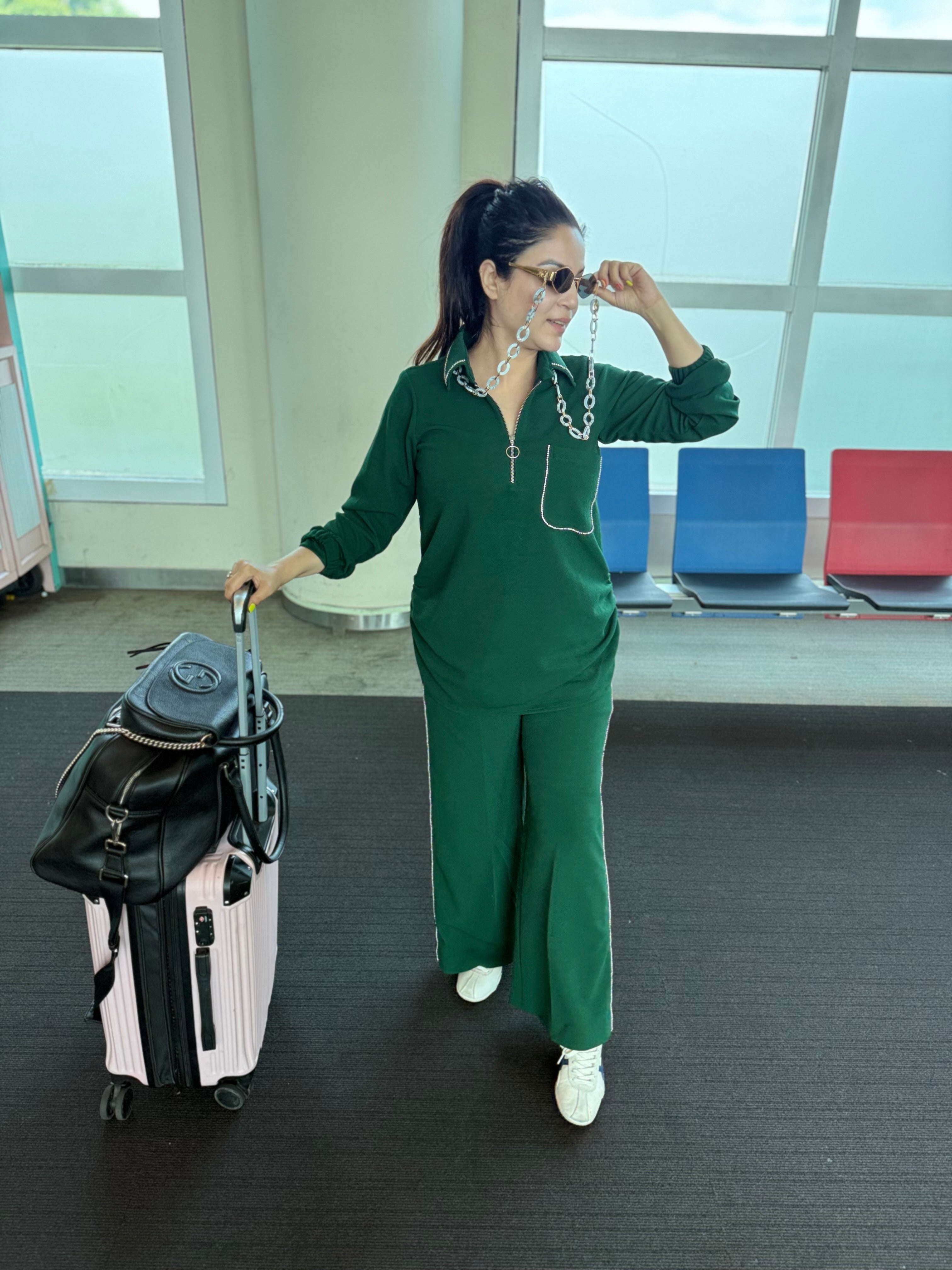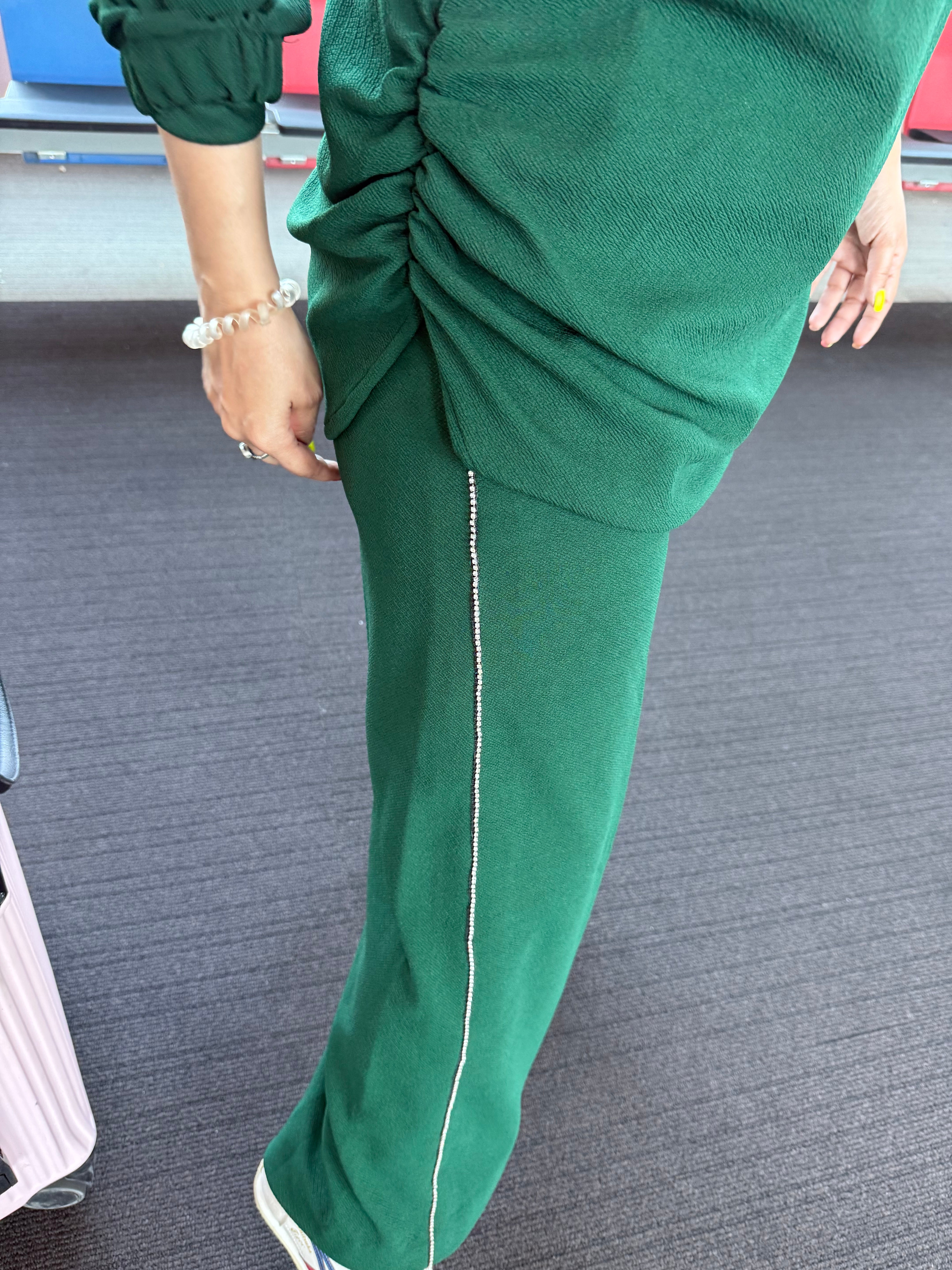 No. of components - 2- shirt & pants , Fabric - Grussian lycra , Color - emerald green, Fit - According to measurements
