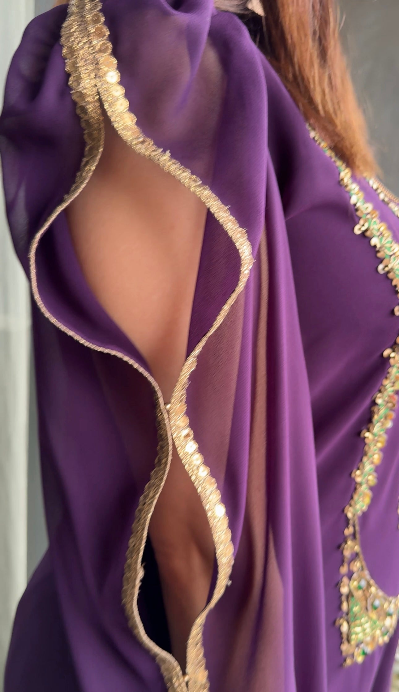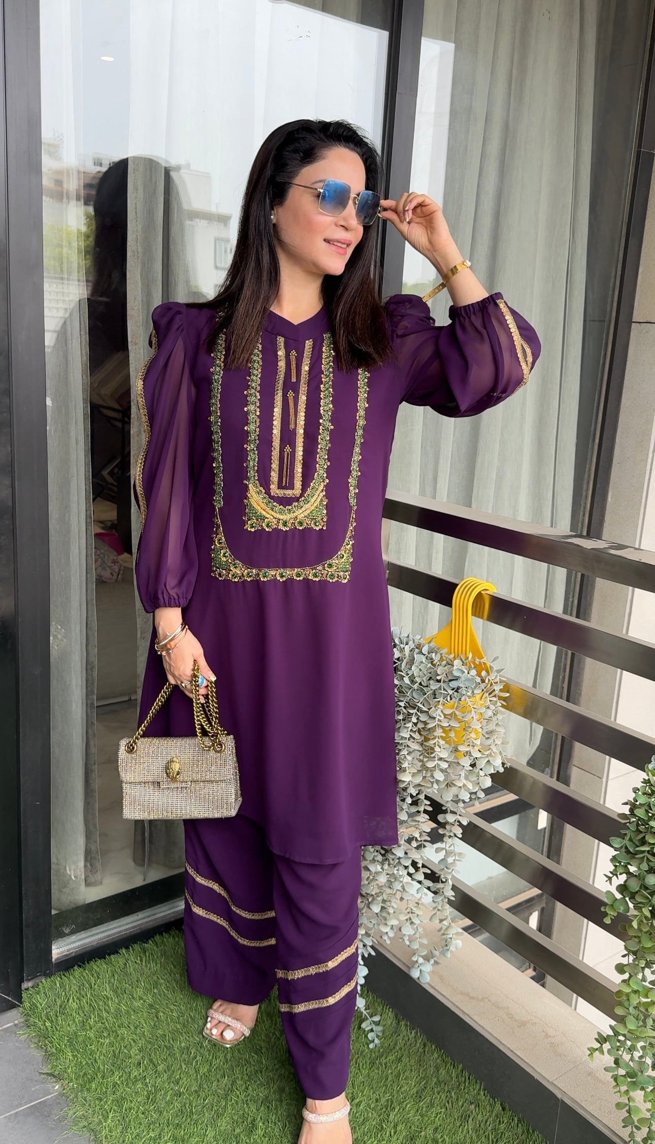 No. of components - 2, Fabric - Georgette , Color - bangani purple, work - Zardosi Handwork, Fit - According to measurements